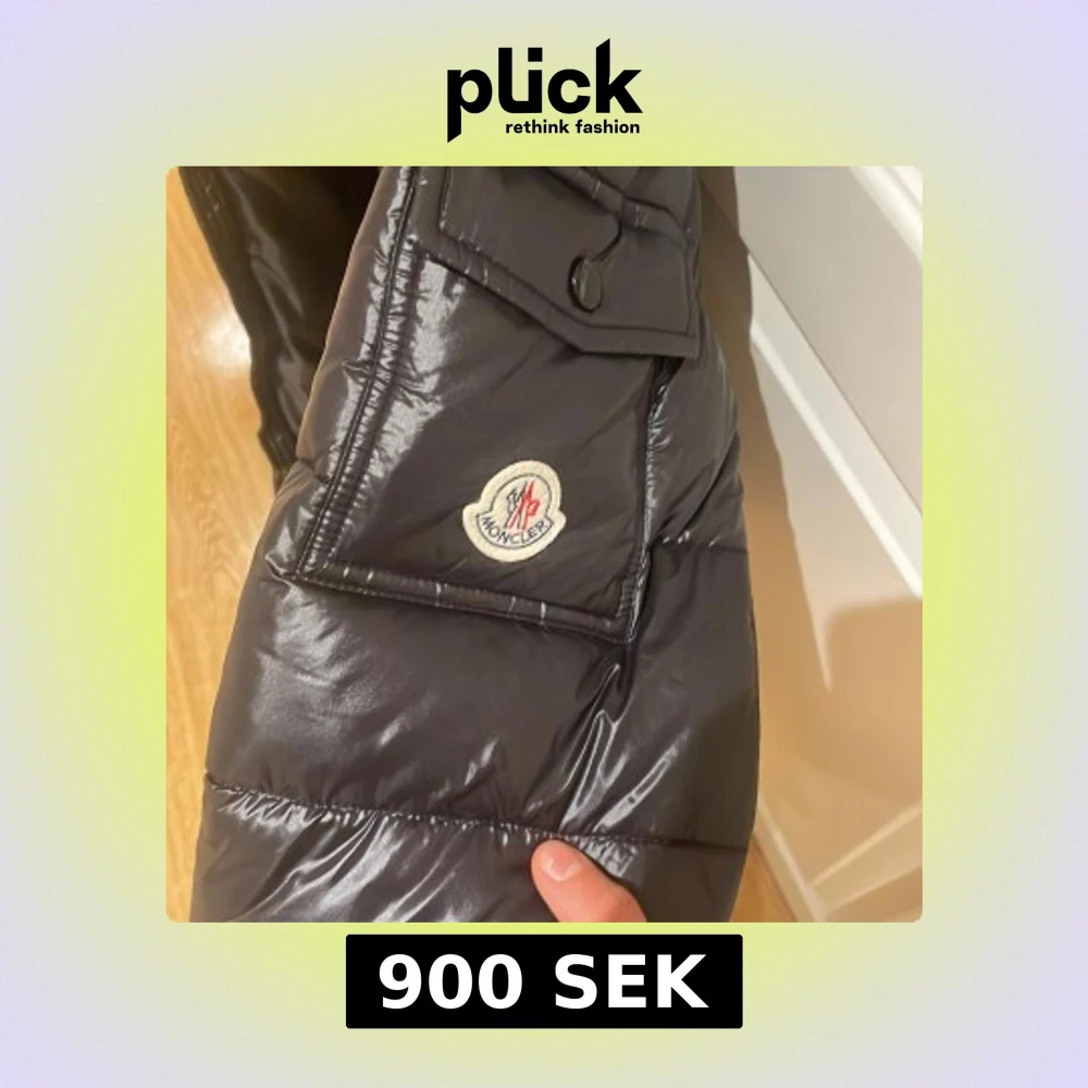 Säljer en snygg svart dunjacka från Moncler. Jackan har en glansig finish och är utrustad med dragkedja och en praktisk ficka på ärmen. Perfekt för kyligare väder och ger en stilren look.