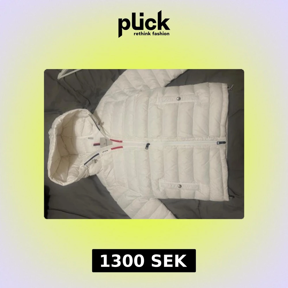 Snygg vit dunjacka från Moncler med huva och quiltad design. Jackan har dragkedja framtill, två fickor med knappstängning och Moncler-logga på ärmen. Insidan har klassisk Moncler-etikett och detaljer i rött och blått vid dragkedjan. Perfekt för kalla dagar.