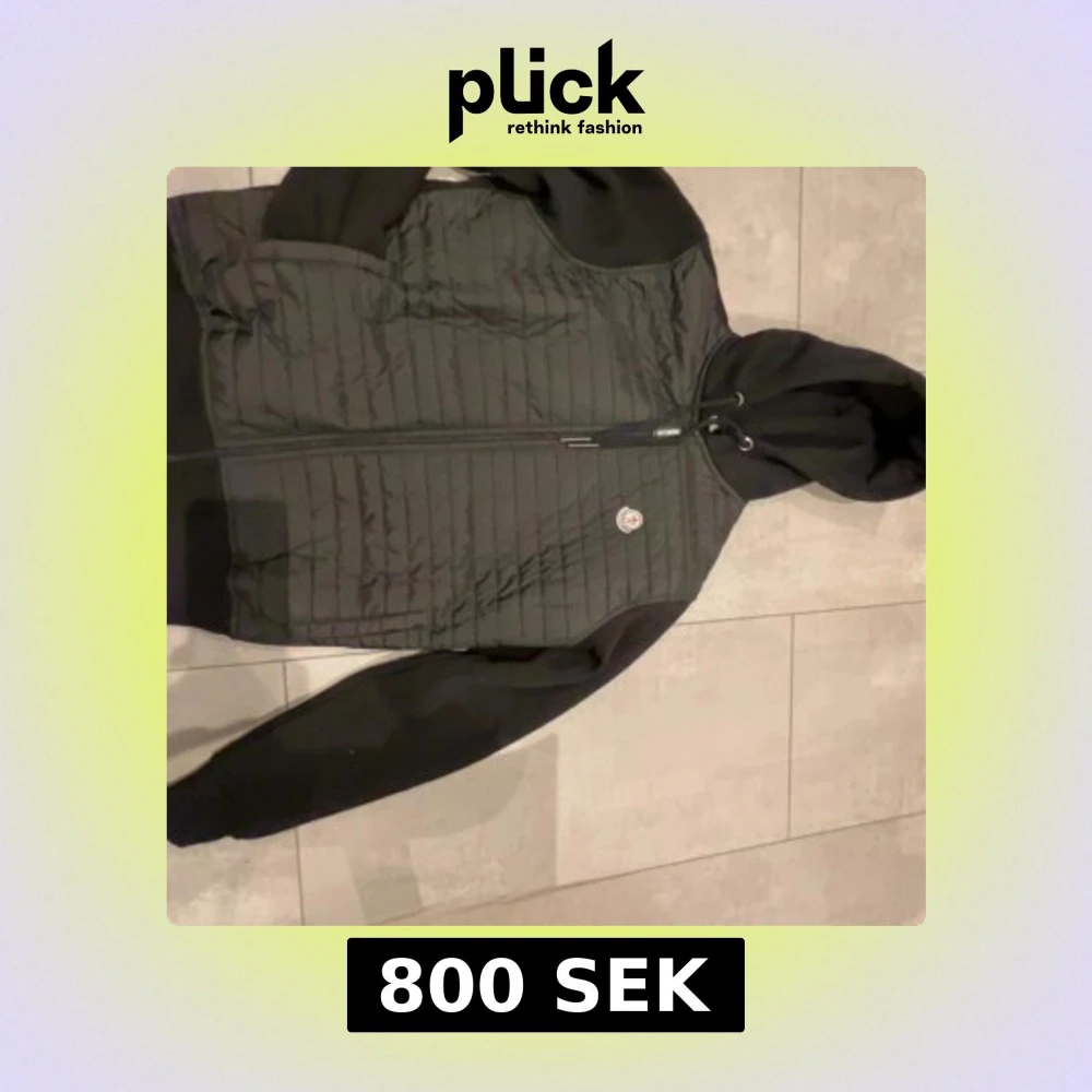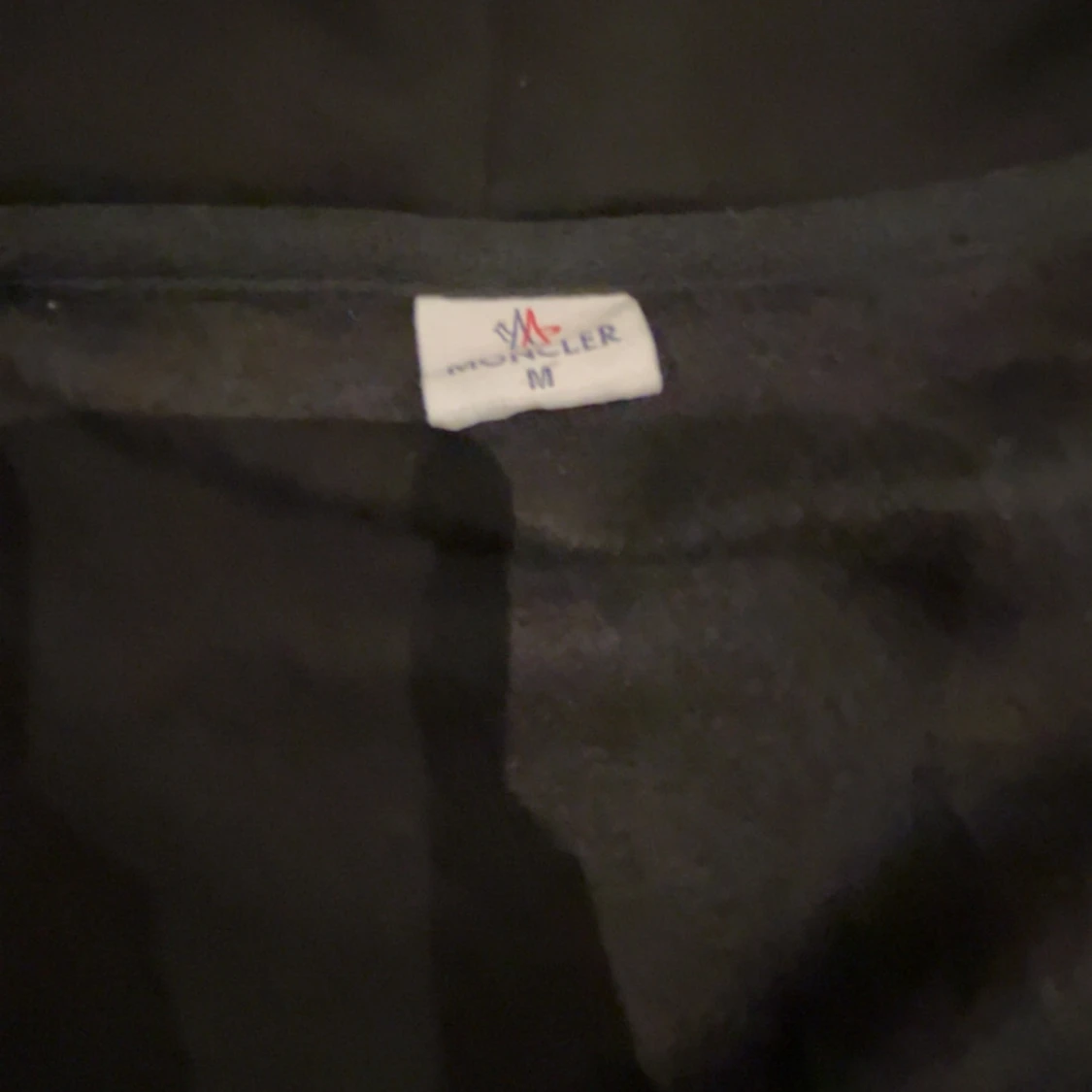 Säljer en svart pufferjacka från Moncler i storlek M. Jackan har quiltad framsida, mjuka ärmar och huva med snörning. Dragkedja framtill och Moncler-logga på bröstet. Perfekt för kyliga dagar och riktigt snygg streetstil.