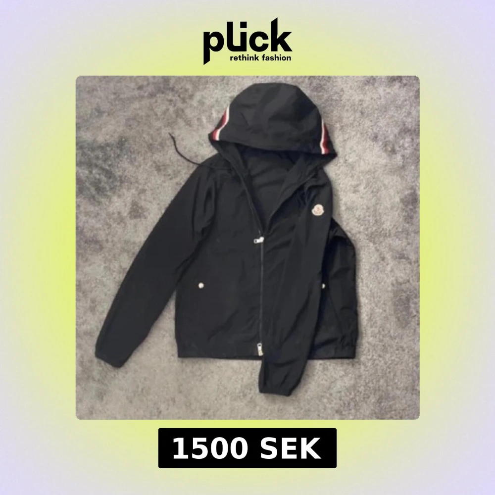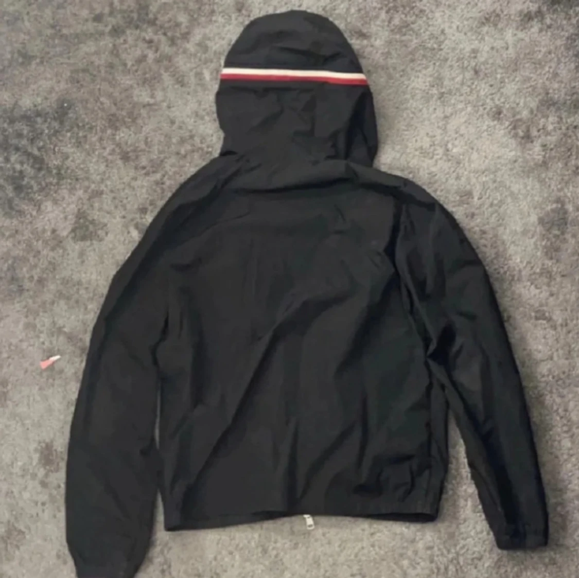 Säljer en svart vindjacka från Moncler med huva och dragkedja. Jackan har Moncler-logga på bröstet och rödvit rand på huvan. Perfekt för blåsiga dagar och enkel att matcha med det mesta.