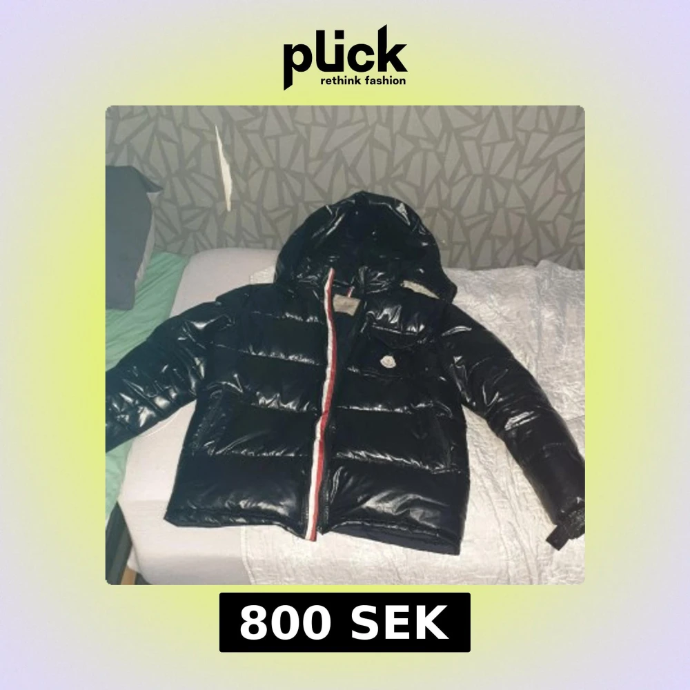 Säljer en svart, glansig pufferjacka från Moncler med huva och dragkedja med rödvit detalj. Jackan har en bröstficka med Moncler-logga och stora fickor framtill. Perfekt för kalla dagar och riktigt snygg streetstil.