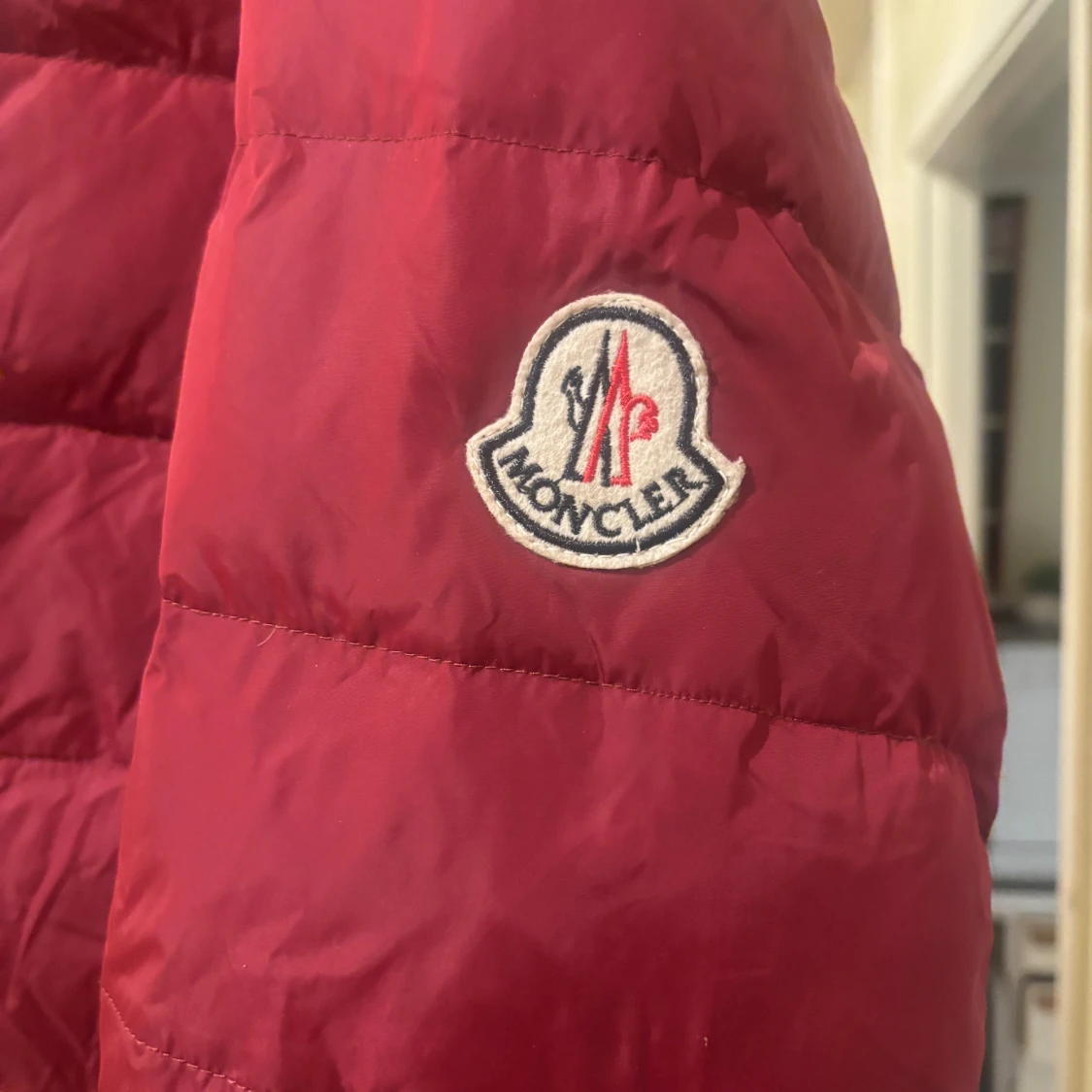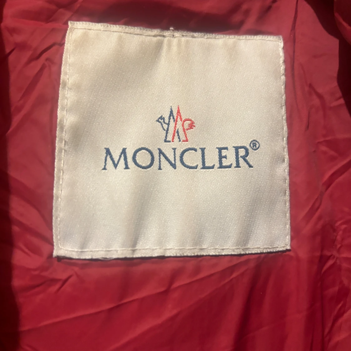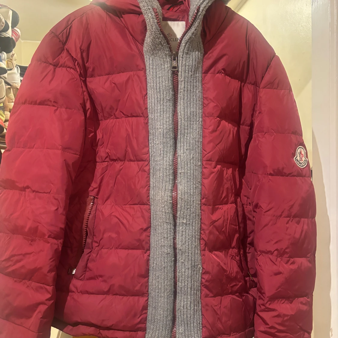 Säljer en röd dunjacka från Moncler med huva och grå stickad kant vid dragkedjan. Jackan har quiltad design, sidofickor med dragkedja och Moncler-logga på ärmen. Perfekt för kalla dagar och har en snygg, sportig look.