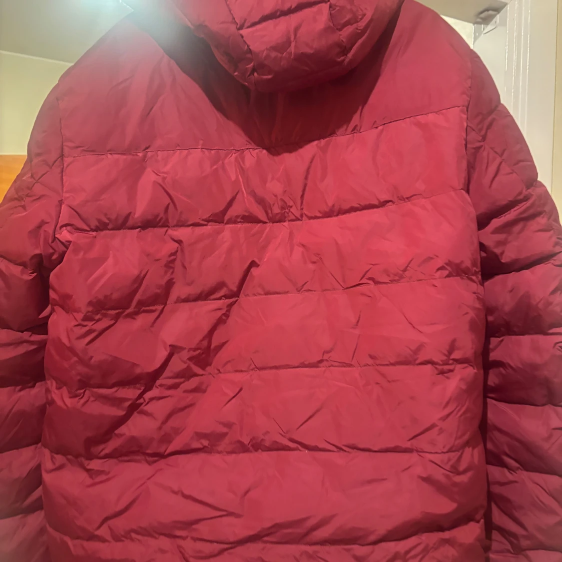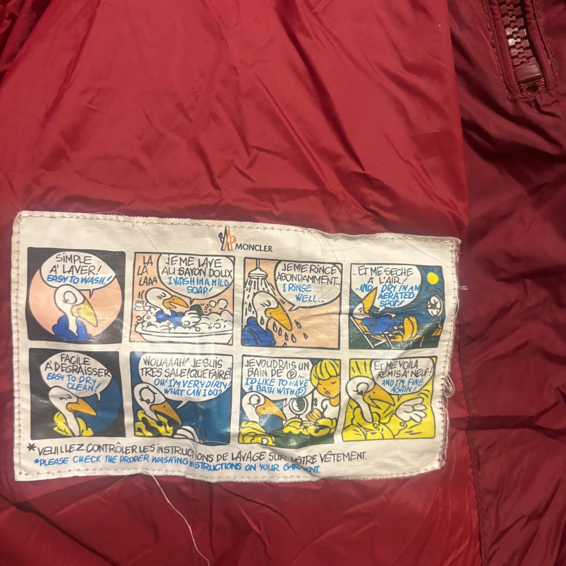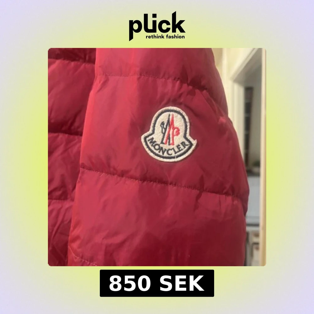 Säljer en röd dunjacka från Moncler med huva och grå stickad kant vid dragkedjan. Jackan har quiltad design, sidofickor med dragkedja och Moncler-logga på ärmen. Perfekt för kalla dagar och har en snygg, sportig look.