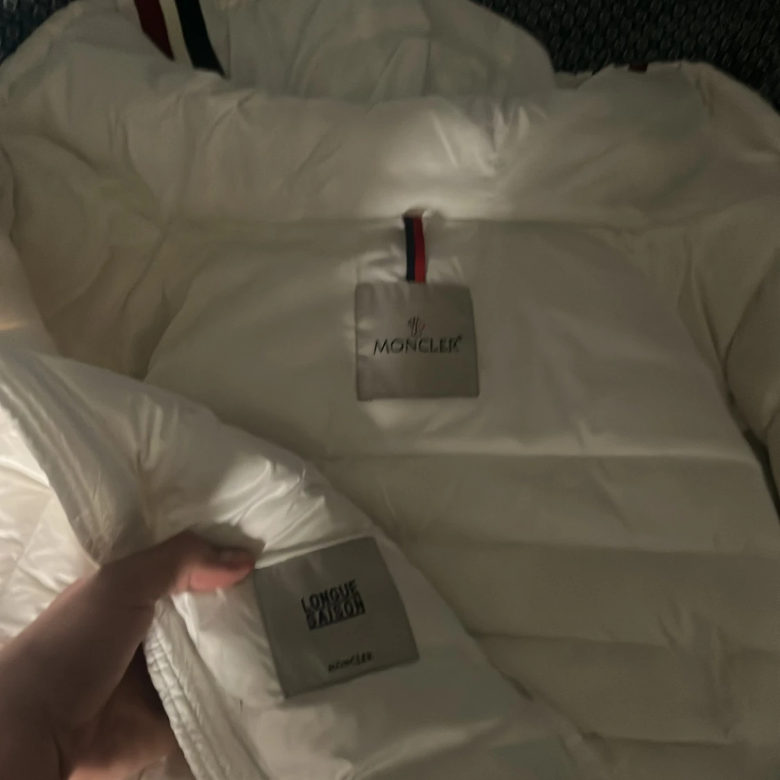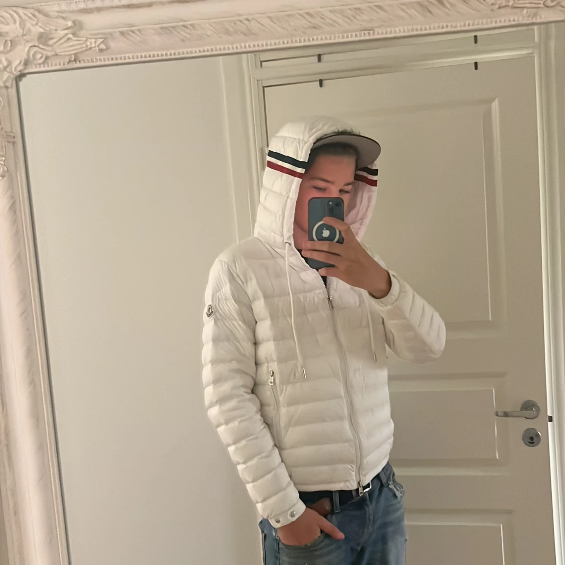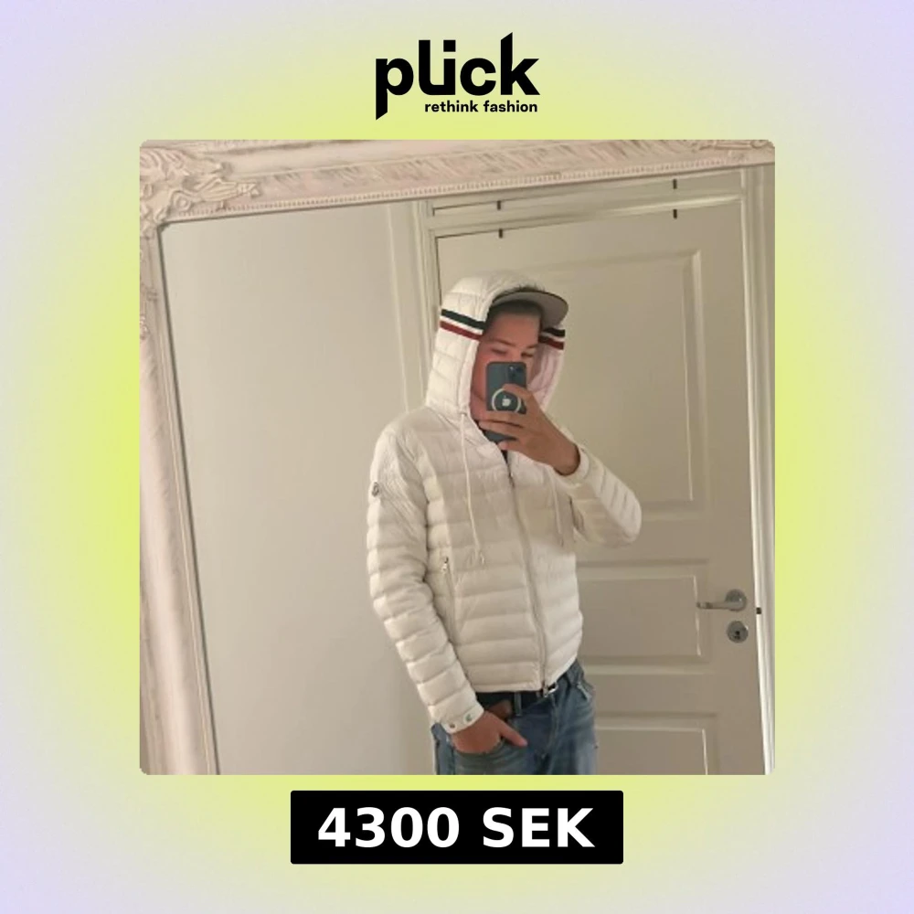 Säljer en snygg vit dunjacka från Moncler med huva och coola ränder i rött och marinblått på kanten. Jackan har dragkedja framtill, två sidofickor med dragkedja och justerbar snörning vid huvan. Perfekt för dig som vill ha en clean och stilren look. Storlek 2/M
