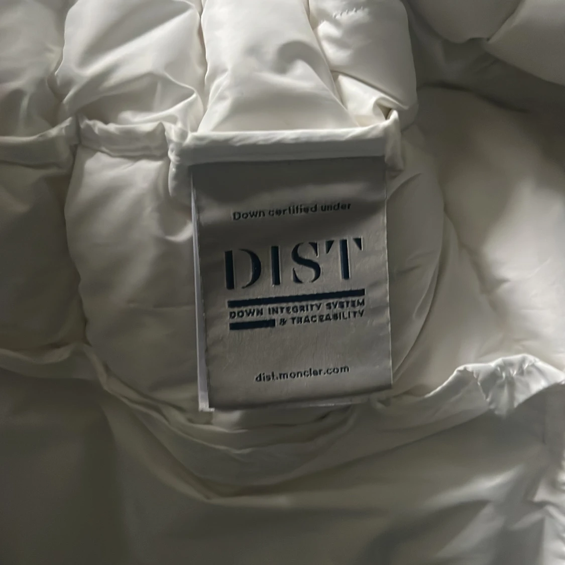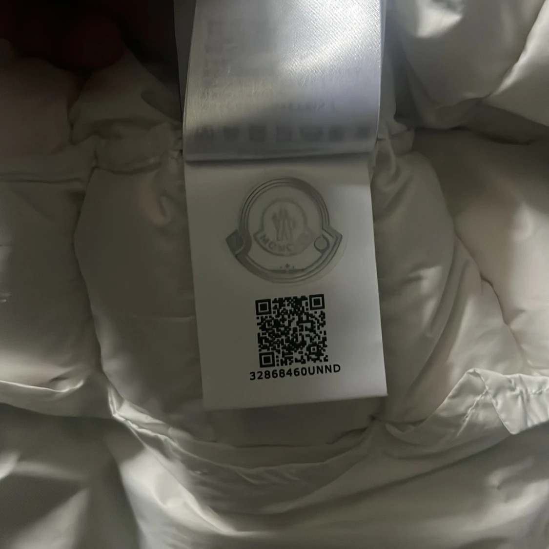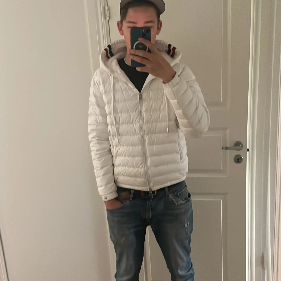 Säljer en snygg vit dunjacka från Moncler med huva och coola ränder i rött och marinblått på kanten. Jackan har dragkedja framtill, två sidofickor med dragkedja och justerbar snörning vid huvan. Perfekt för dig som vill ha en clean och stilren look. Storlek 2/M