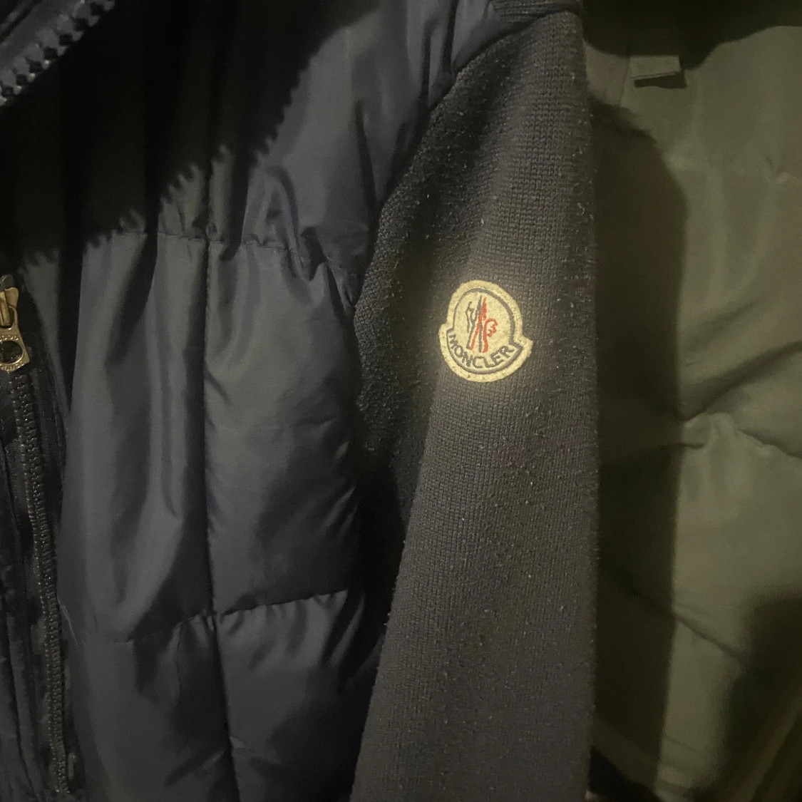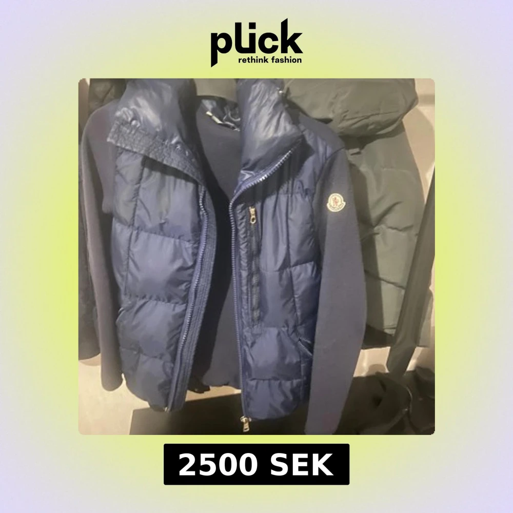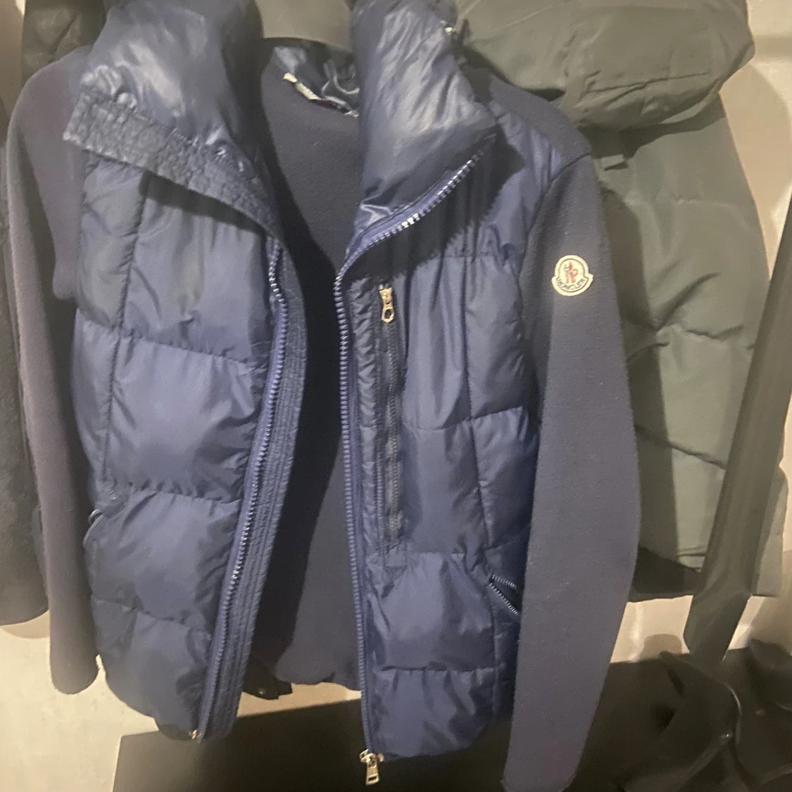 Snygg mörkblå dunjacka från Moncler med stickade ärmar och vadderad framsida. Jackan har dragkedja, huva och klassisk Moncler-logga på ärmen. Perfekt för kyliga dagar och ger en sportig men clean look.