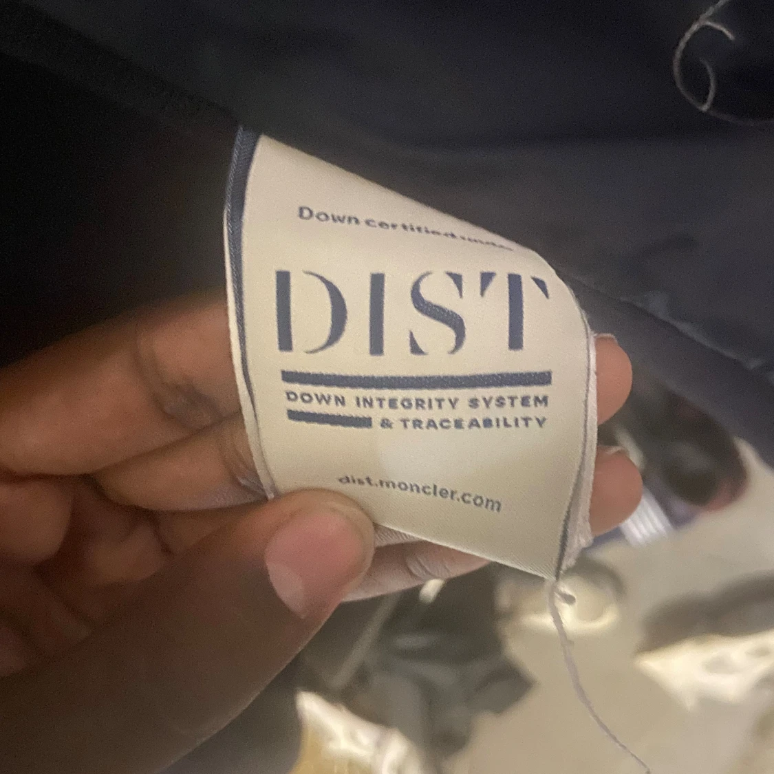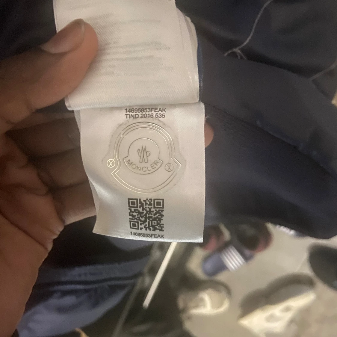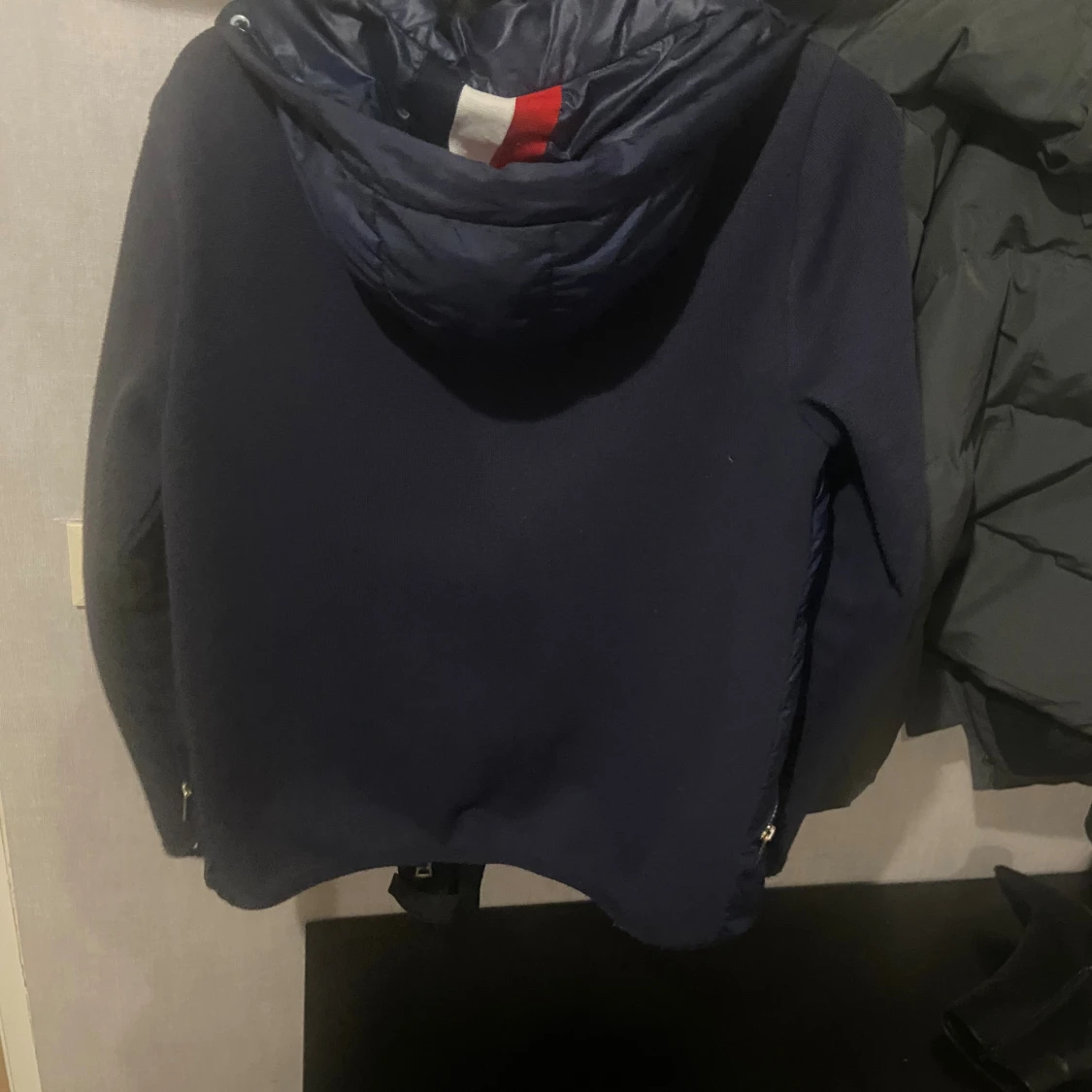Snygg mörkblå dunjacka från Moncler med stickade ärmar och vadderad framsida. Jackan har dragkedja, huva och klassisk Moncler-logga på ärmen. Perfekt för kyliga dagar och ger en sportig men clean look.
