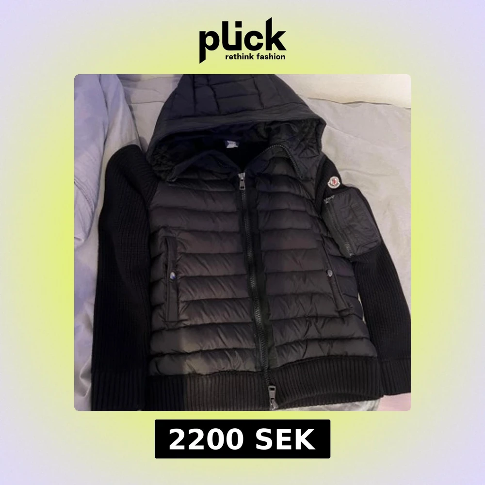 Säljer en svart pufferjacka från Moncler med stickade ärmar och huva. Jackan har dragkedja framtill, två fickor med knappar och Moncler-logga på ärmen. Perfekt för kyliga dagar och riktigt snygg streetstil.