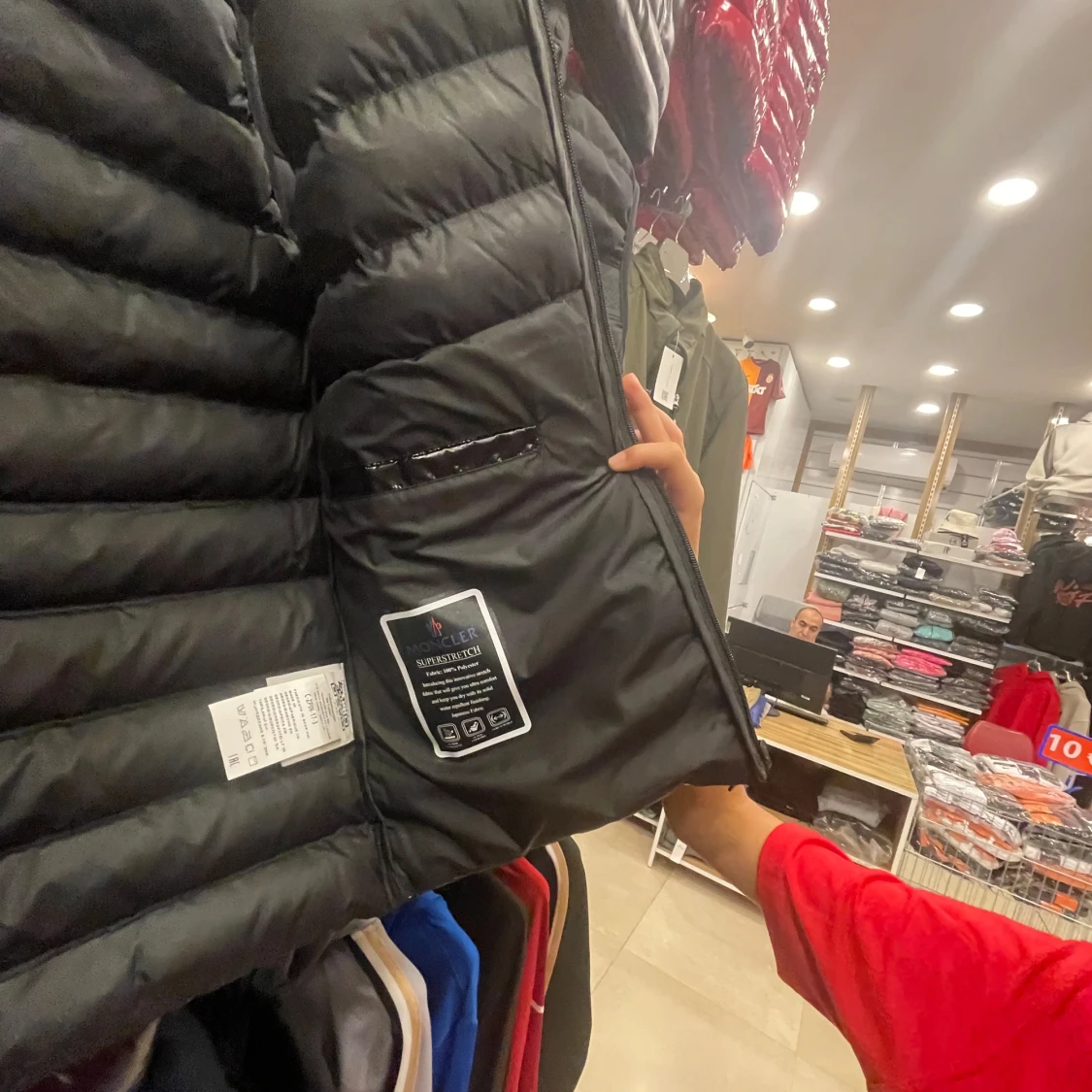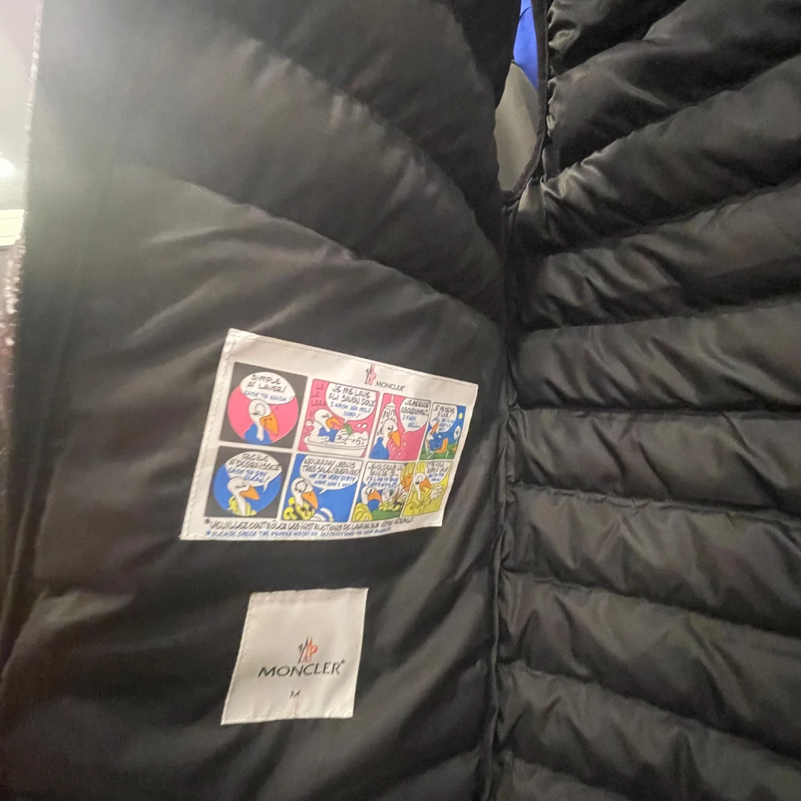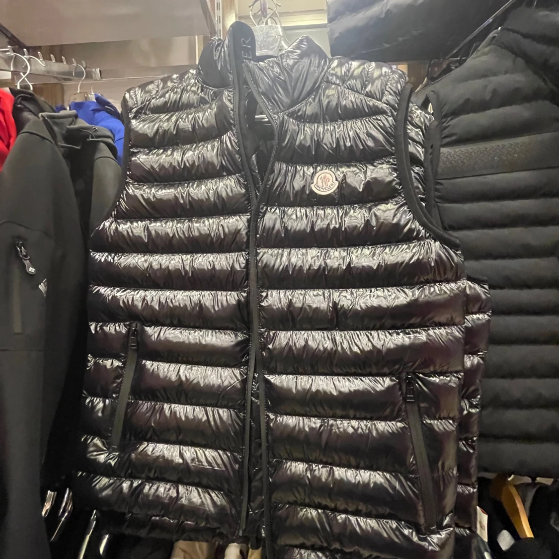 Snygg svart dunväst från Moncler med glansig finish och klassisk quiltad design. Västen har hög krage, dragkedja framtill och två fickor med dragkedja. Ikonisk Moncler-logga på bröstet och coolt serietryck på insidan. Perfekt för lager-på-lager-stil.