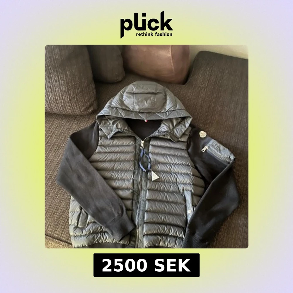 Snygg svart cardigan från Moncler med stickade svarta ärmar och vadderad kropp. Västen har huva, dragkedja framtill, fickor med tryckknapp och en liten ärmficka med dragkedja. Klassisk Moncler-logga på ärmen, perfekt till hösten!