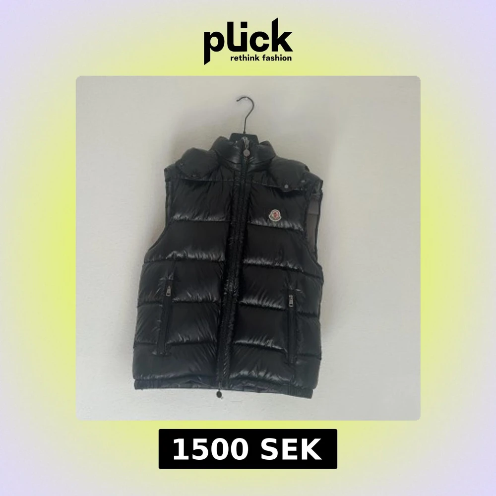 Snygg svart dunväst från Moncler med glansig finish och klassisk logga på bröstet. Västen har hög krage, två fickor med dragkedja och quiltad design. Perfekt för lager-på-lager och streetstyle.