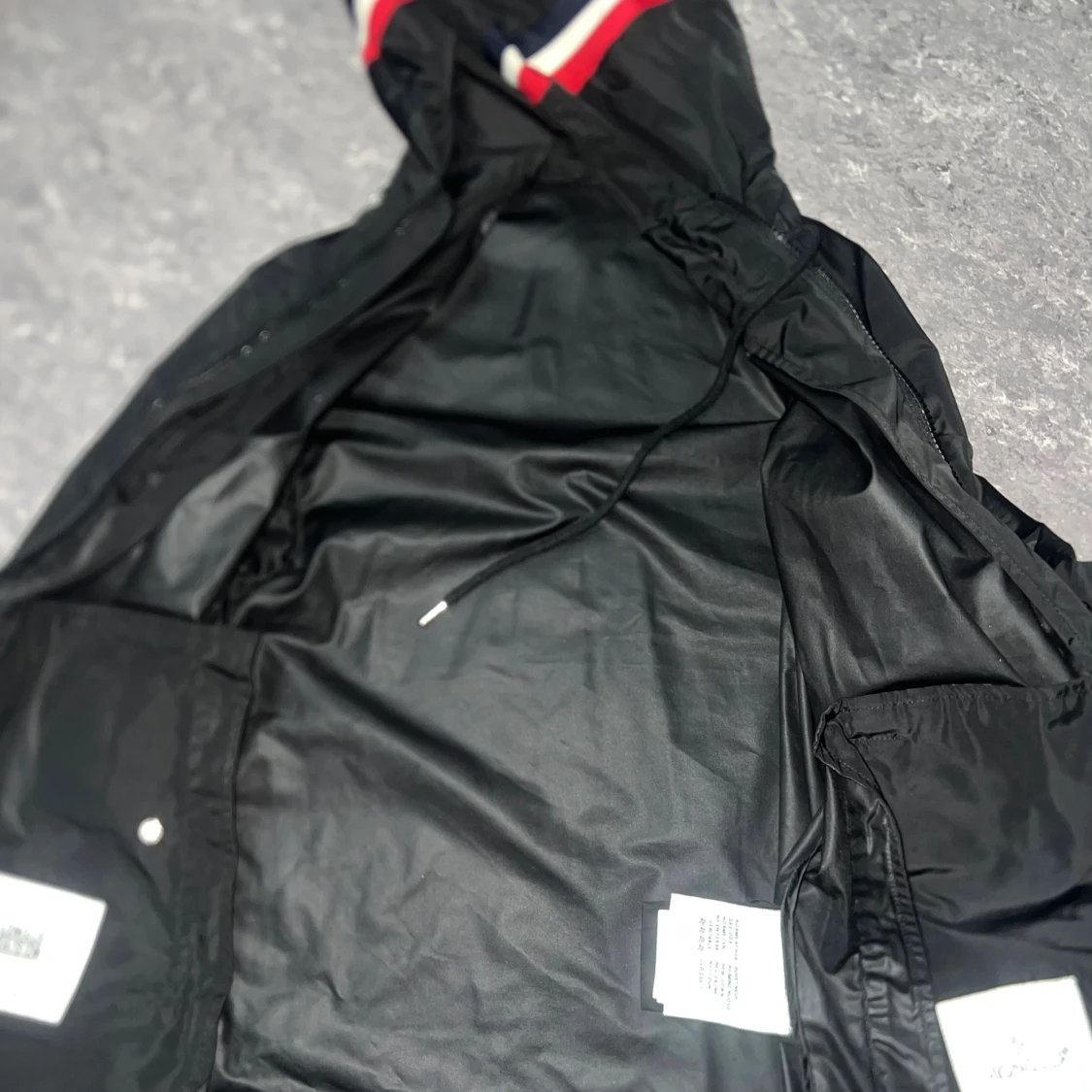 Svart vindjacka från Moncler med klassisk logga på ärmen. Jackan har huva med snörning, dragkedja framtill och innerfoder. Snygga detaljer med Monclers signaturfärger i luvan. Perfekt för dig som vill ha en stilren och sportig look.