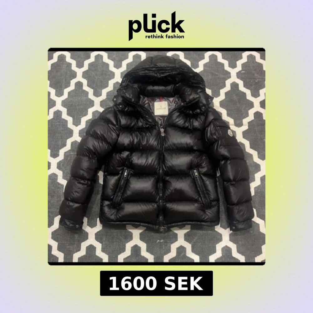 Säljer en svart pufferjacka från Moncler med glansig finish och huva. Jackan har två dragkedjeförsedda fickor, Moncler-logga på ärmen och kraftig vaddering som håller dig varm. Perfekt för kalla dagar och har en snygg, modern look. Finns i storlek S och M