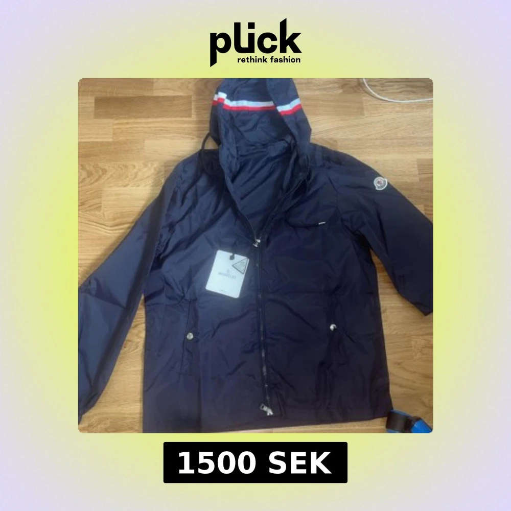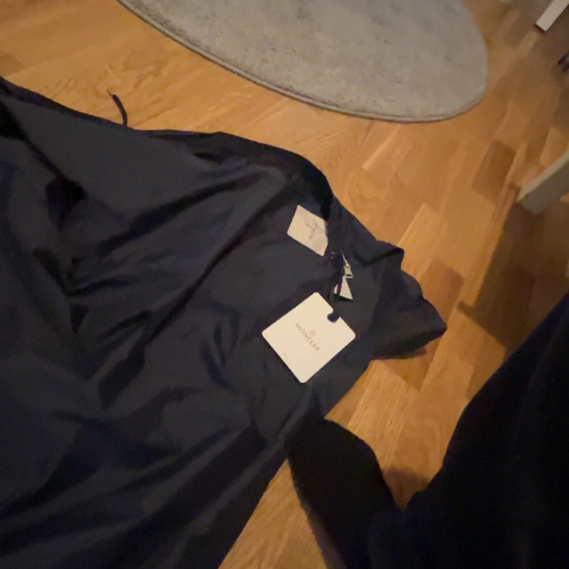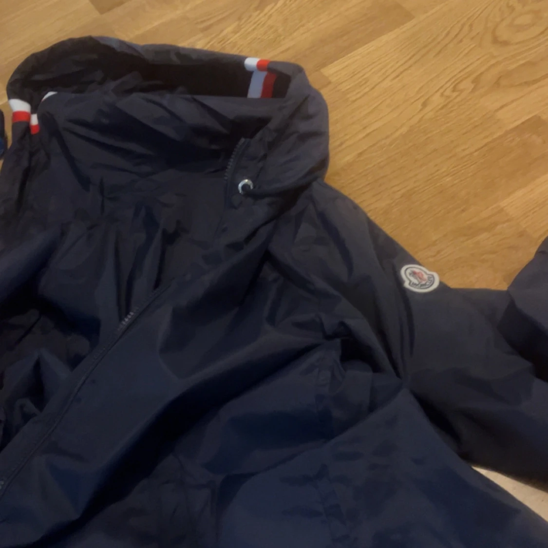 Äkta! Snygg mörkblå vindjacka från Moncler med huva och dragkedja framtill. Jackan har vita och röda detaljer på huvan samt Moncler-logga på ärmen. Perfekt för blåsiga dagar.