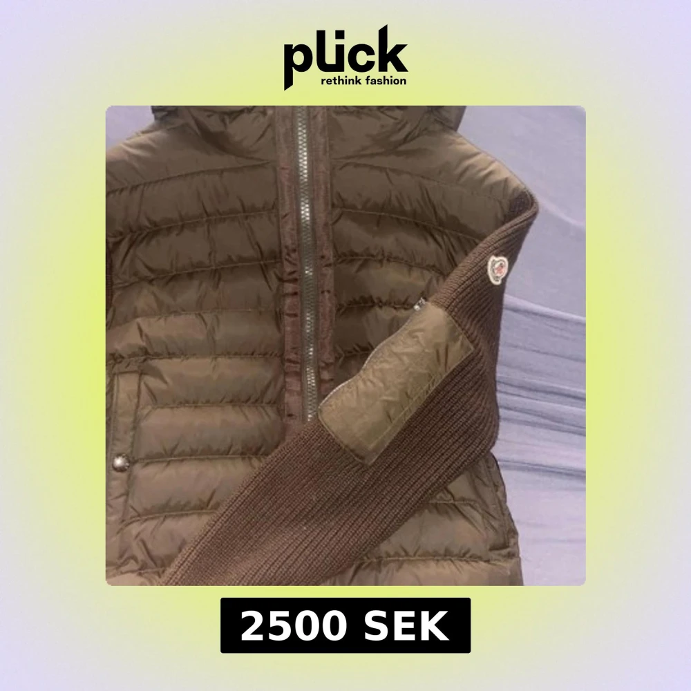 Säljer en brun Moncler dunjacka med stickade ärmar och detaljer i samma färg. Jackan har dragkedja framtill, quiltad kropp och Moncler-logga på ärmen. Perfekt för dig som vill ha en snygg och varm jacka med unik design och premiumkänsla.