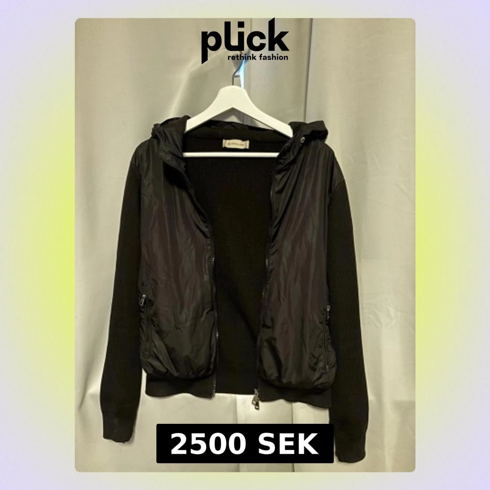 Säljer en svart Moncler jacka med stickade ärmar och rygg samt glansig front i syntetmaterial. Jackan har huva, tvåvägsdragkedja och fickor med dragkedja. Diskret Moncler-logga på ärmen. Perfekt för dig som vill ha en clean och sportig look. Den har ett litet hål och slits slitningar på muddarna, skriv för bilder😊