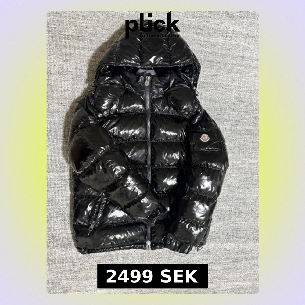 Säljer en svart, glansig pufferjacka från Moncler med huva och dragkedja framtill. Jackan har Moncler-logga på ärmen, quiltad design och innerfoder med serietidningsmönster. Perfekt för dig som vill ha en varm och snygg vinterjacka med street vibe.