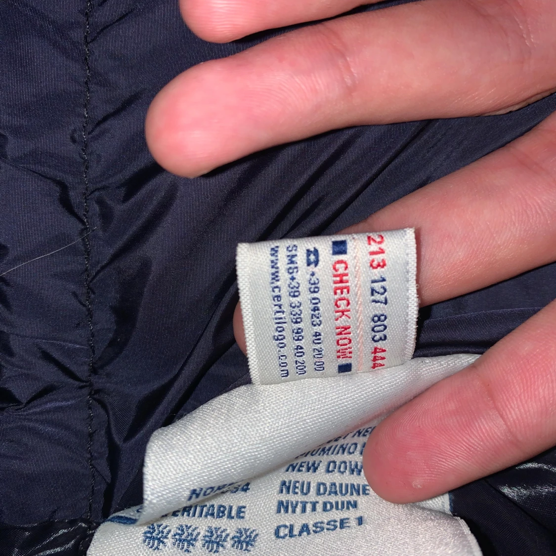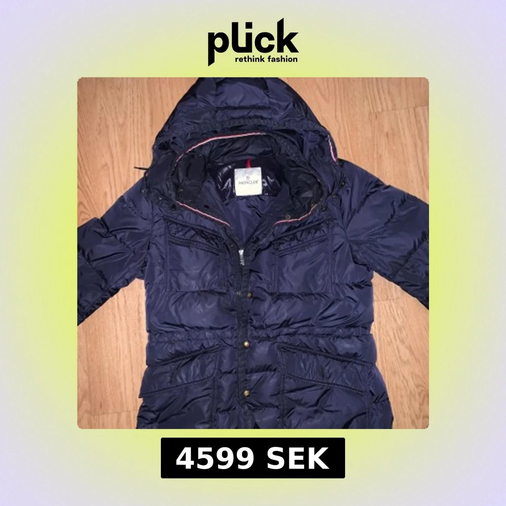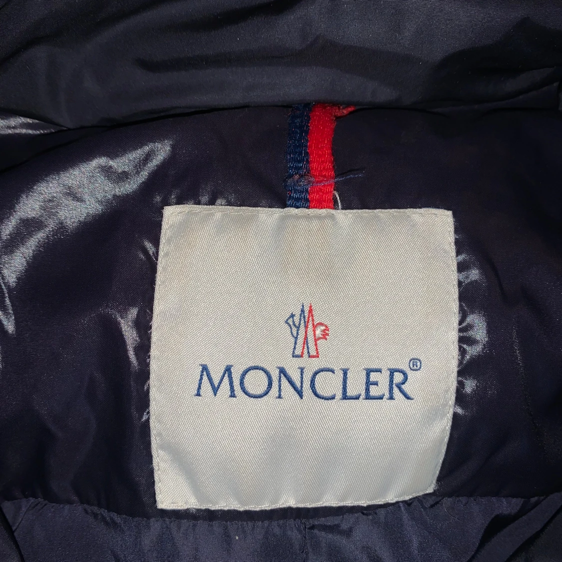 Snygg mörkblå dunjacka från Moncler med huva och flera fickor framtill. Jackan har dragkedja och knappar, samt en sportig look med lätt glansigt material. Perfekt för kalla dagar och riktigt stilren att bära.