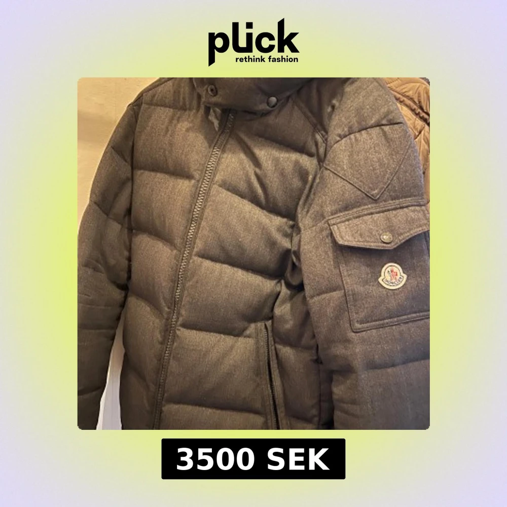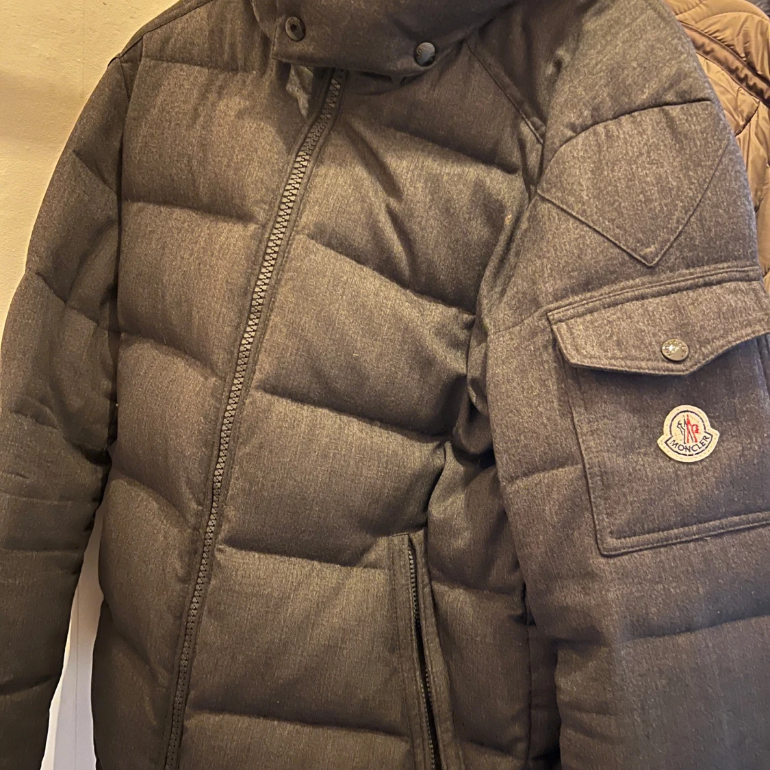 Snygg grå dunjacka från Moncler med quiltad design och dragkedja framtill. Jackan har en hög krage och en ficka med knapp på ärmen. Perfekt för kyliga dagar.