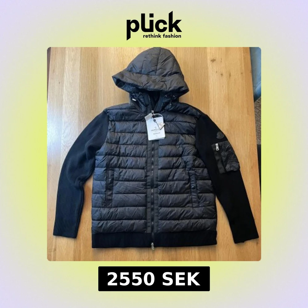 Svart pufferjacka från Moncler med stickade ärmar och quiltad front. Jackan har huva, dragkedja framtill och en praktisk ficka med dragkedja på ärmen. Perfekt för dig som vill ha en snygg och sportig look med premiumkänsla.