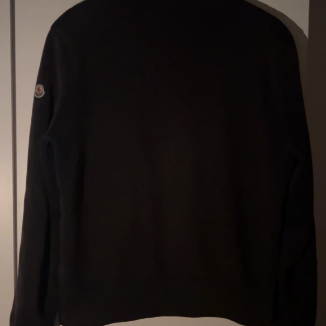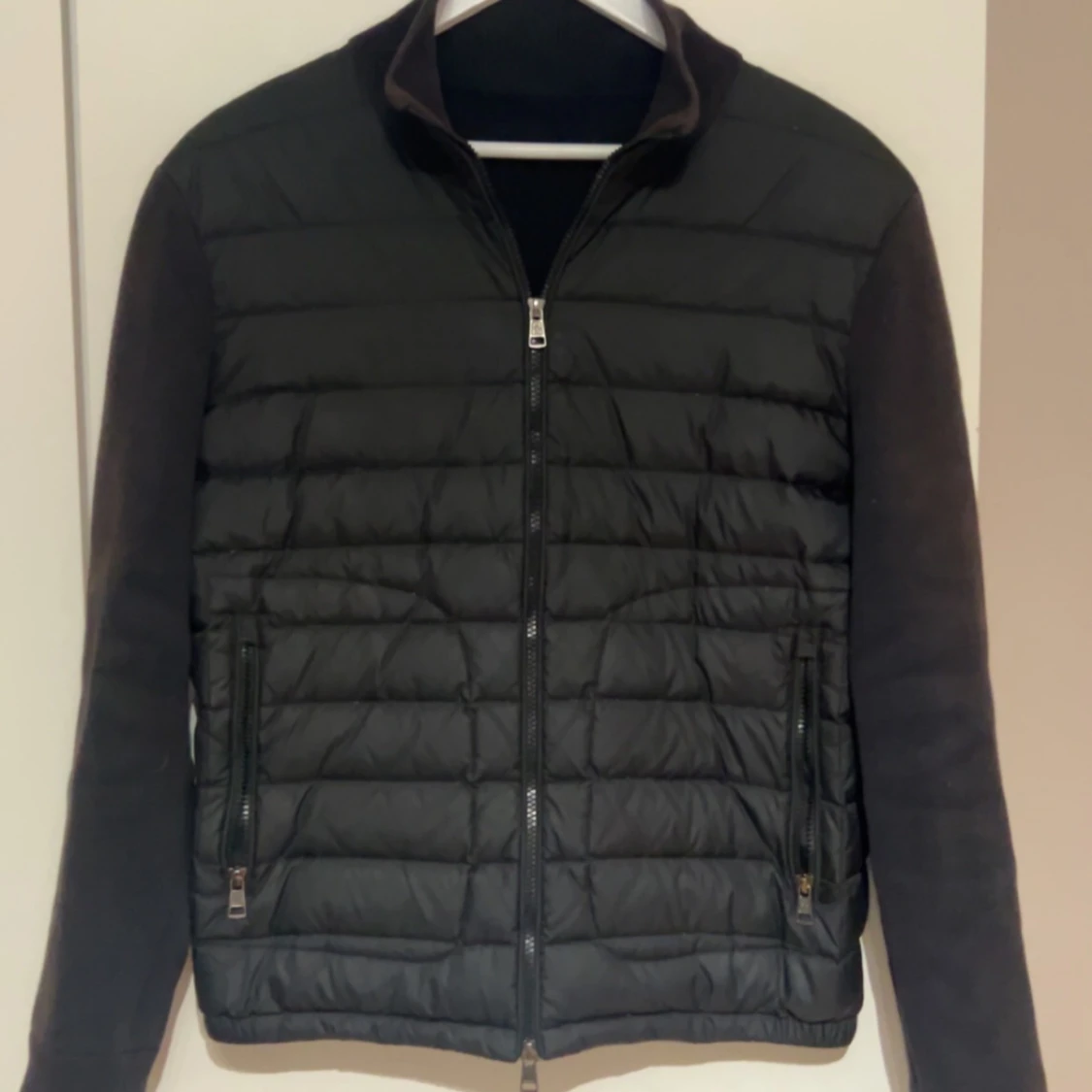 Säljer en svart pufferjacka från Moncler med quiltad framsida och släta ärmar. Jackan har två sidofickor med dragkedja och en hög krage. Moncler-logga på vänster ärm. Perfekt för dig som vill ha en stilren och varm jacka. Dm för mer bilder