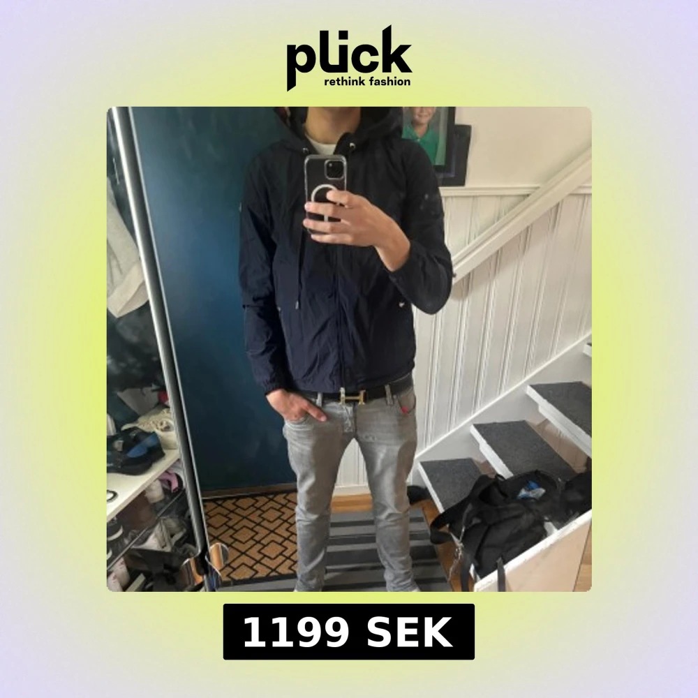 Säljer en mörkblå vindjacka från Moncler med huva och dragsko. Jackan har dragkedja framtill, Moncler-logga på ärmen och snygga detaljer i rött och vitt på huvan. Perfekt för dig som vill ha en stilren och sportig look.
