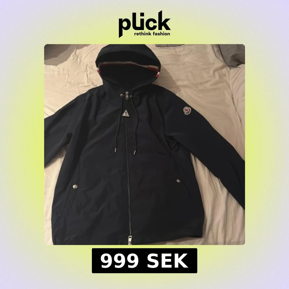 Snygg mörkblå vindjacka från Moncler med huva och coola detaljer som snörning och dragkedja framtill. Jackan har Moncler-logga på ärmen och silverfärgade knappar vid fickorna. Perfekt för dig som gillar stilren design och exklusiva märken. Lappar till jackan finns också!