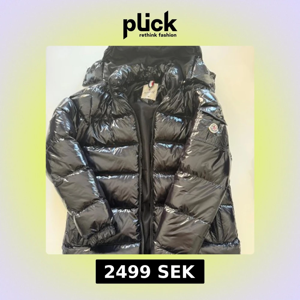 Snygg svart glansig dunjacka från Moncler med huva och dragkedja. Jackan har en quiltad design och är perfekt för kyligare väder. Den har en klassisk Moncler-logga på ärmen och en praktisk innerficka med röd dragkedja. NFC Funkar dessutom!