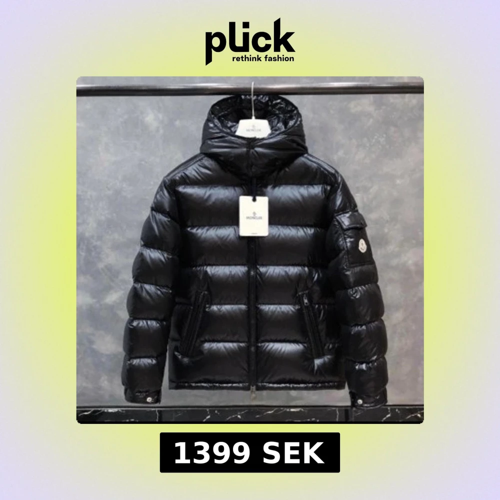 Säljer en svart pufferjacka från Moncler med glansig finish och huva. Jackan har dragkedja framtill, två sidofickor med dragkedja och en liten ficka på ärmen med Moncler-logga. Perfekt för kalla dagar och har en riktigt snygg streetstil.