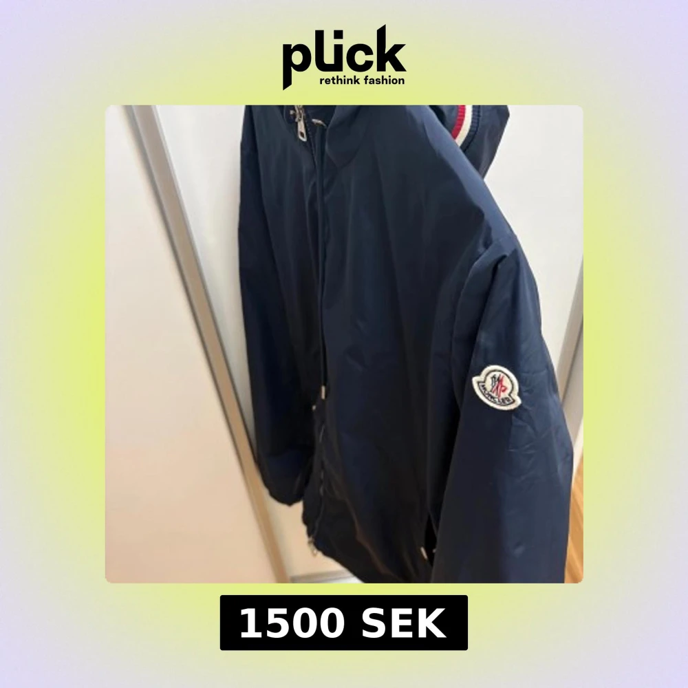 Snygg mörkblå vindjacka från Moncler med huva och dragkedja framtill. Jackan har snörning vid halsen, två fickor med tryckknappar och Moncler-logga på ärmen. Rödvit rand på huvan ger extra stilpoäng. Perfekt för dig som gillar clean och sportig look.