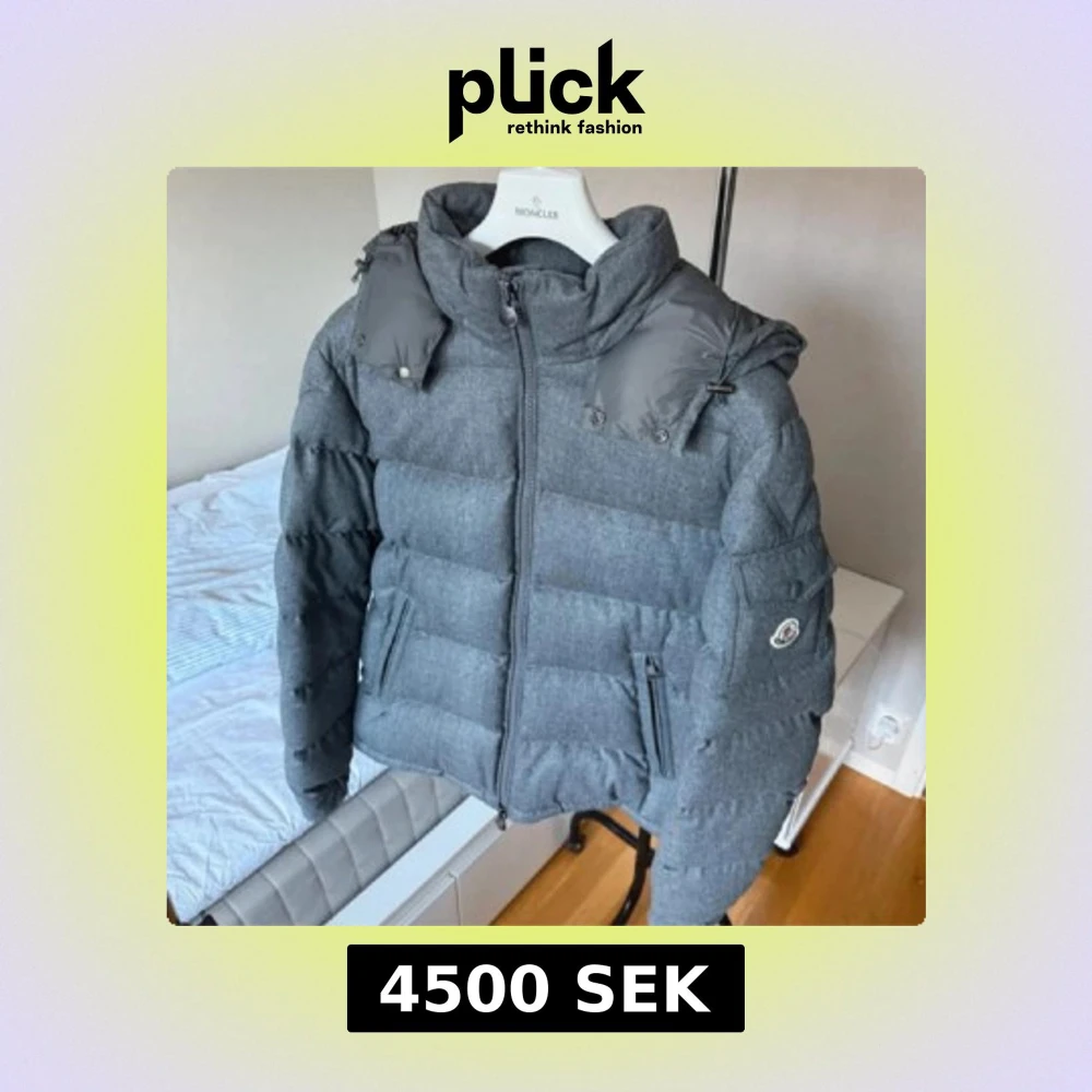 Säljer en snygg grå dunjacka från Moncler med dragkedja och hög krage. Jackan har långa ärmar och en broderad Moncler-logga på ärmen. Perfekt för kyliga dagar med sin quiltade design.