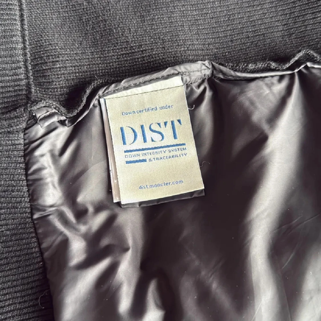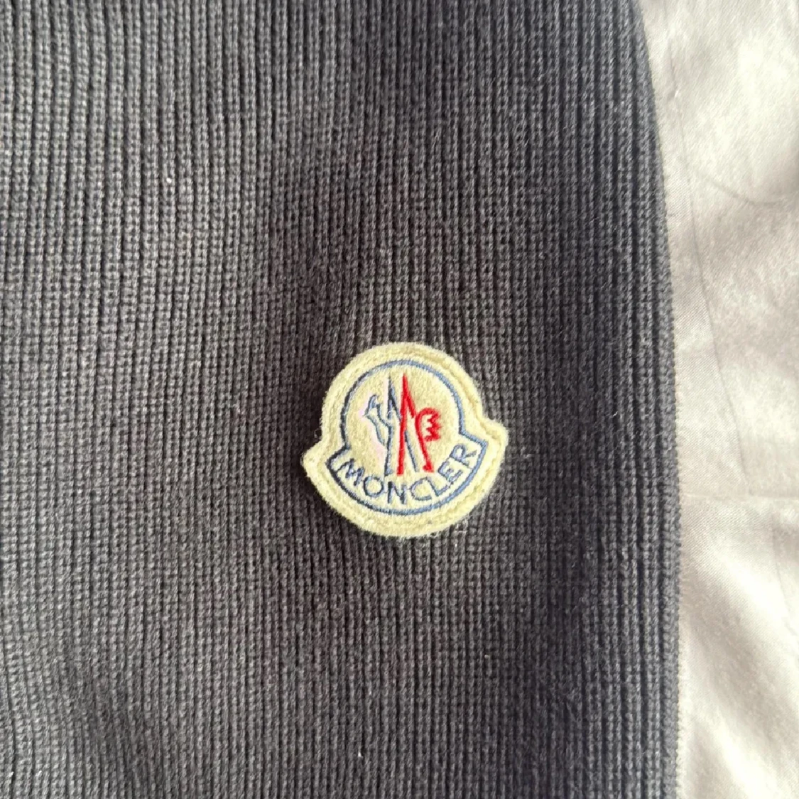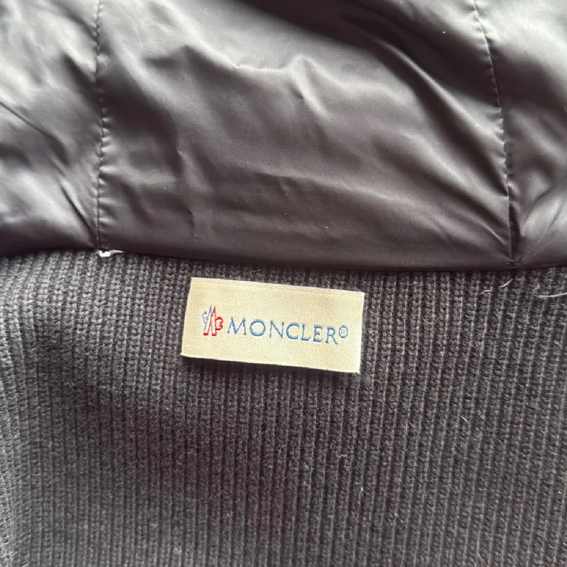 Svart pufferjacka från Moncler med stickade ärmar och quiltad kropp. Jackan har huva, dragkedja framtill och två fickor med tryckknappar. Moncler-logga på ena ärmen och ribbade muddar vid ärmslut och nederkant. Perfekt för kyliga dagar.