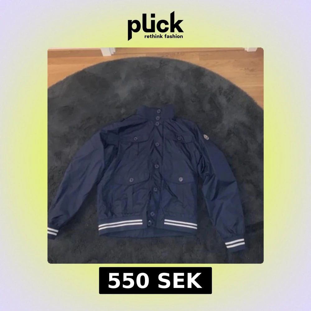 Snygg mörkblå vindjacka från Moncler med klassisk logga på ärmen. Jackan har flera fickor med knappar, hög krage och vita ränder på muddar och midja. Tillverkad i lätt polyester, perfekt för dig som vill ha en stilren och sportig look.