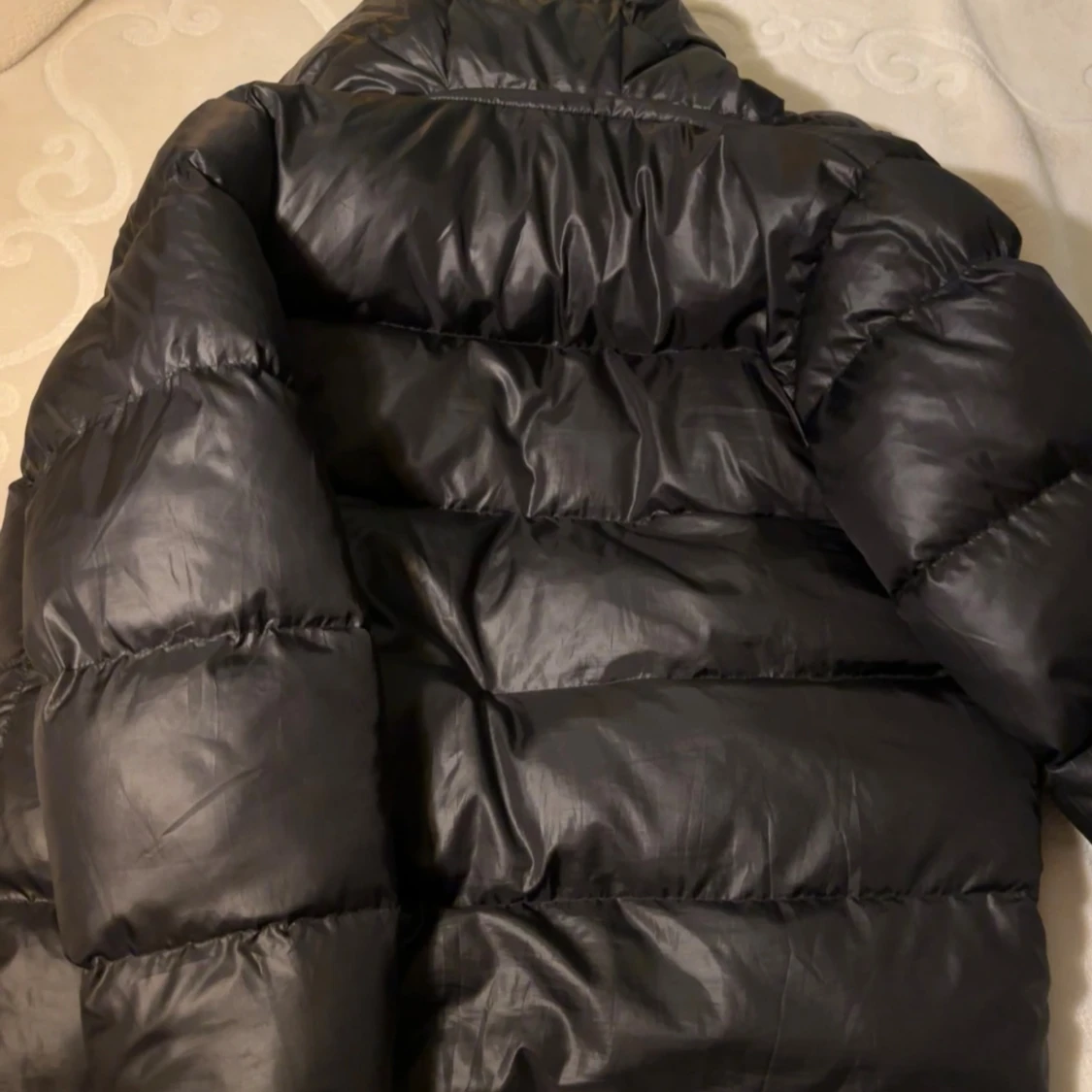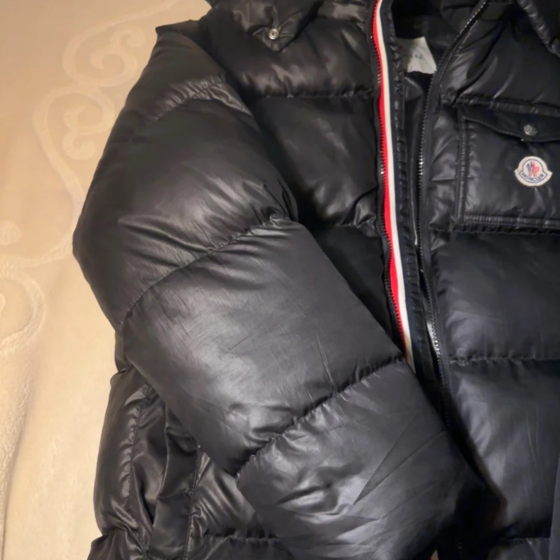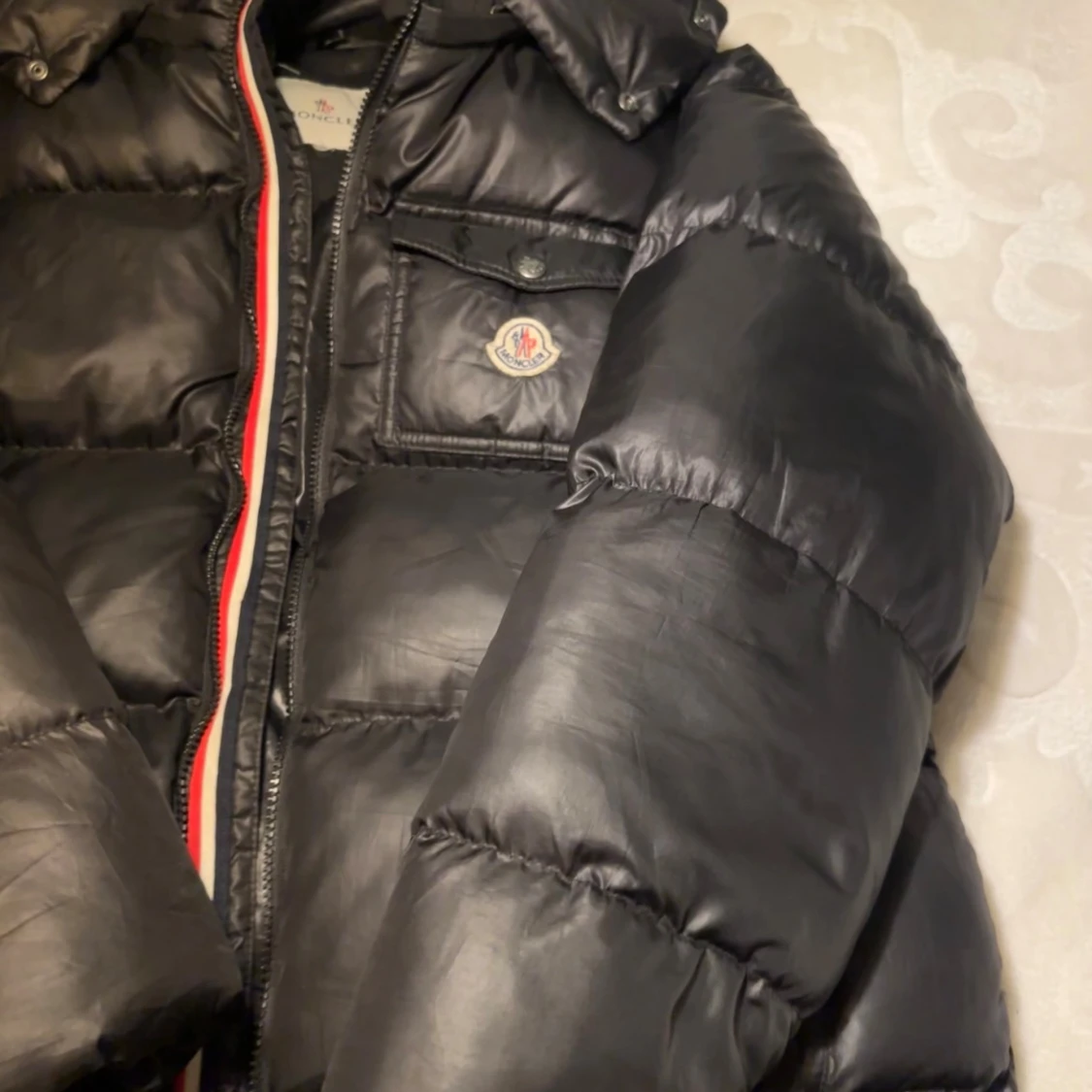 Säljer en svart pufferjacka från Moncler med glansig finish, huva och klassisk logga på bröstet. Jackan har dragkedja med rödvit detalj, en bröstficka med knapp och vadderad design som håller dig varm. Perfekt för kalla dagar och riktigt snygg streetstil.