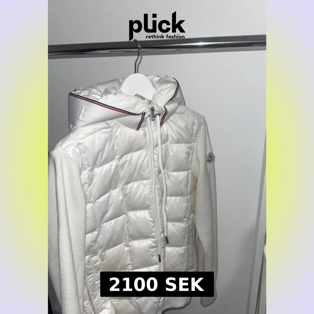 Säljer en vit moncler cardigan Jackan har huva med broderad logga och röd/blå kant, samt dragkedja framtill.
