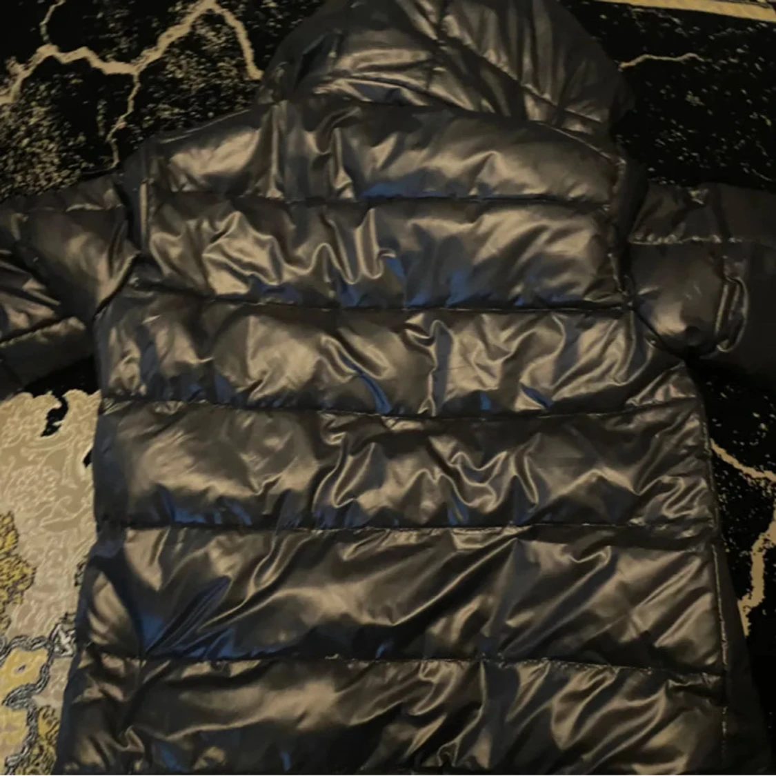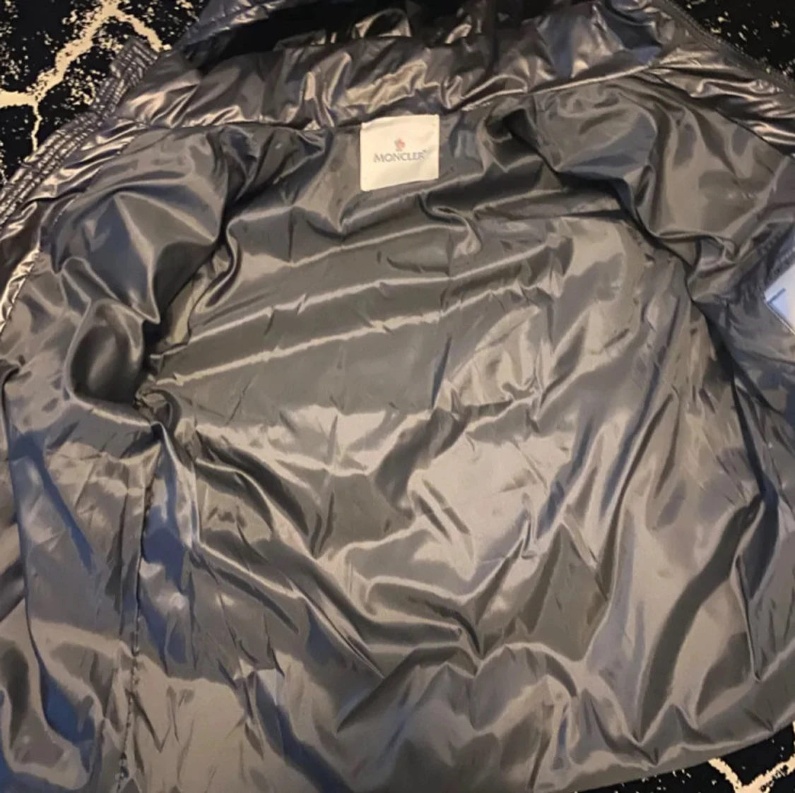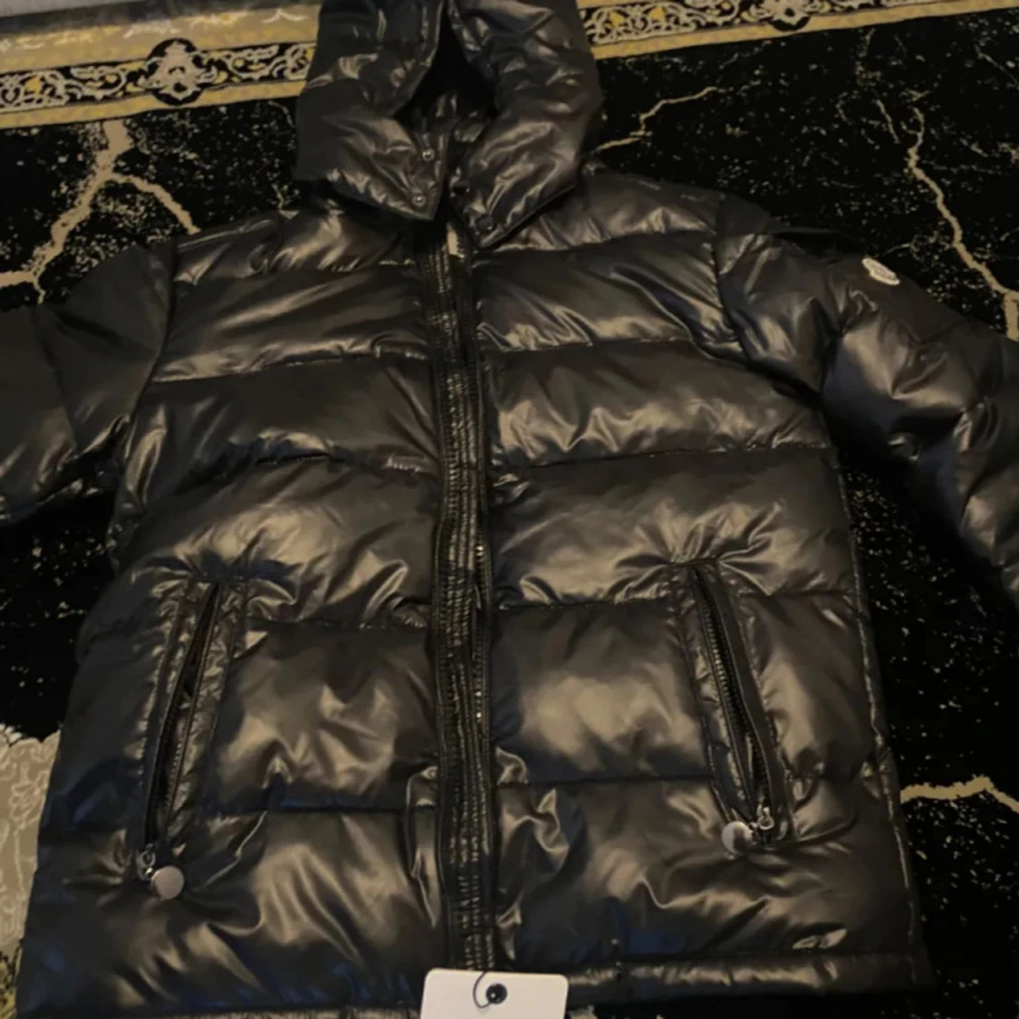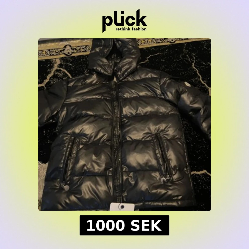 Säljer en svart pufferjacka från Moncler med glansig finish och huva. Jackan har två fickor med dragkedja framtill och klassisk Moncler-logga på ärmen. Perfekt för kalla dagar och riktigt snygg streetstil.