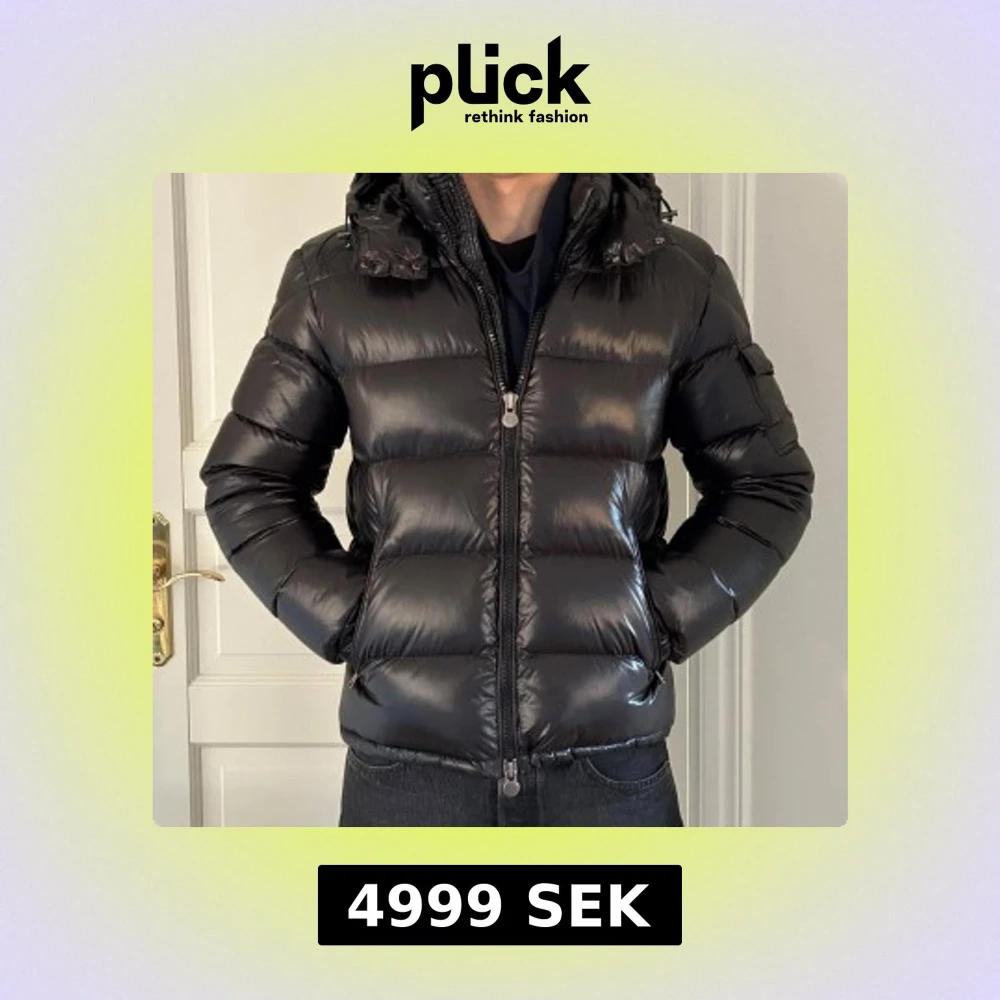 Säljer en svart pufferjacka från Moncler med glansig finish, huva och praktisk ficka med logotyp på ärmen. Jackan har dragkedja framtill och är vadderad för extra värme. Perfekt för dig som vill ha en snygg och ikonisk vinterjacka.