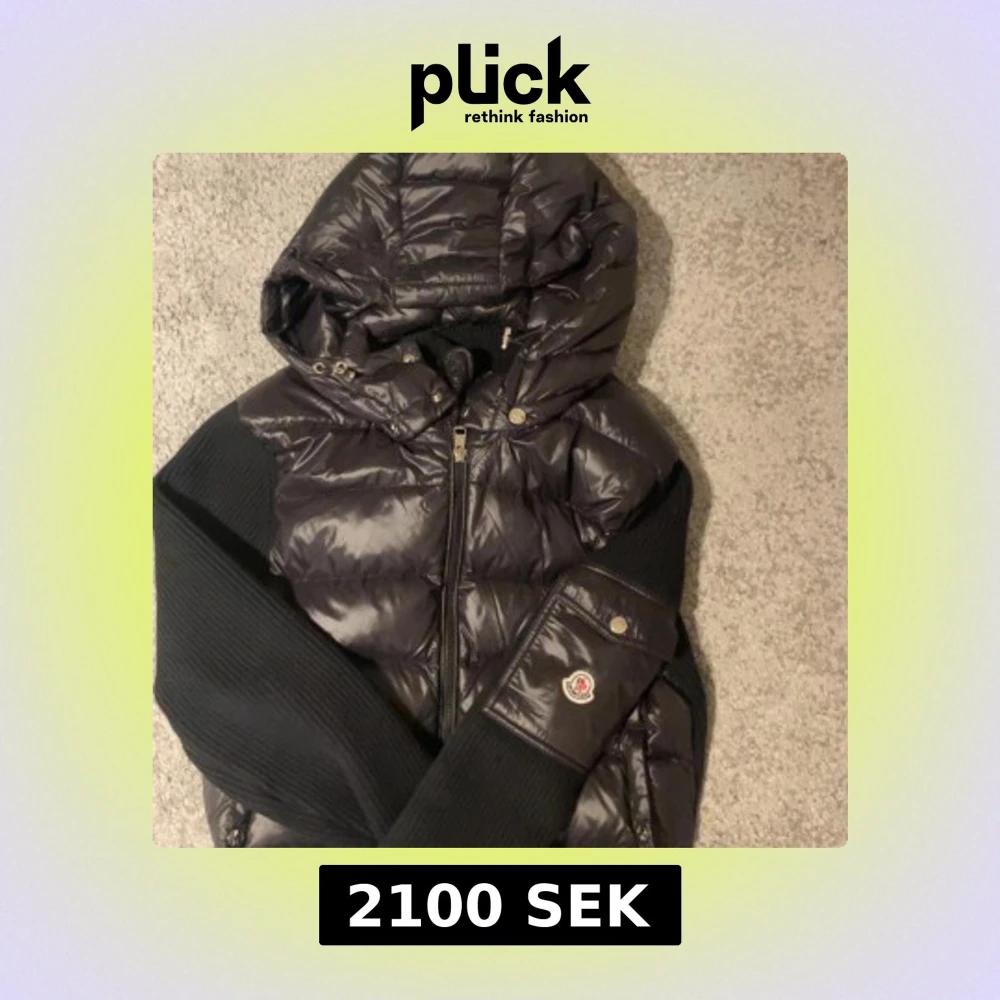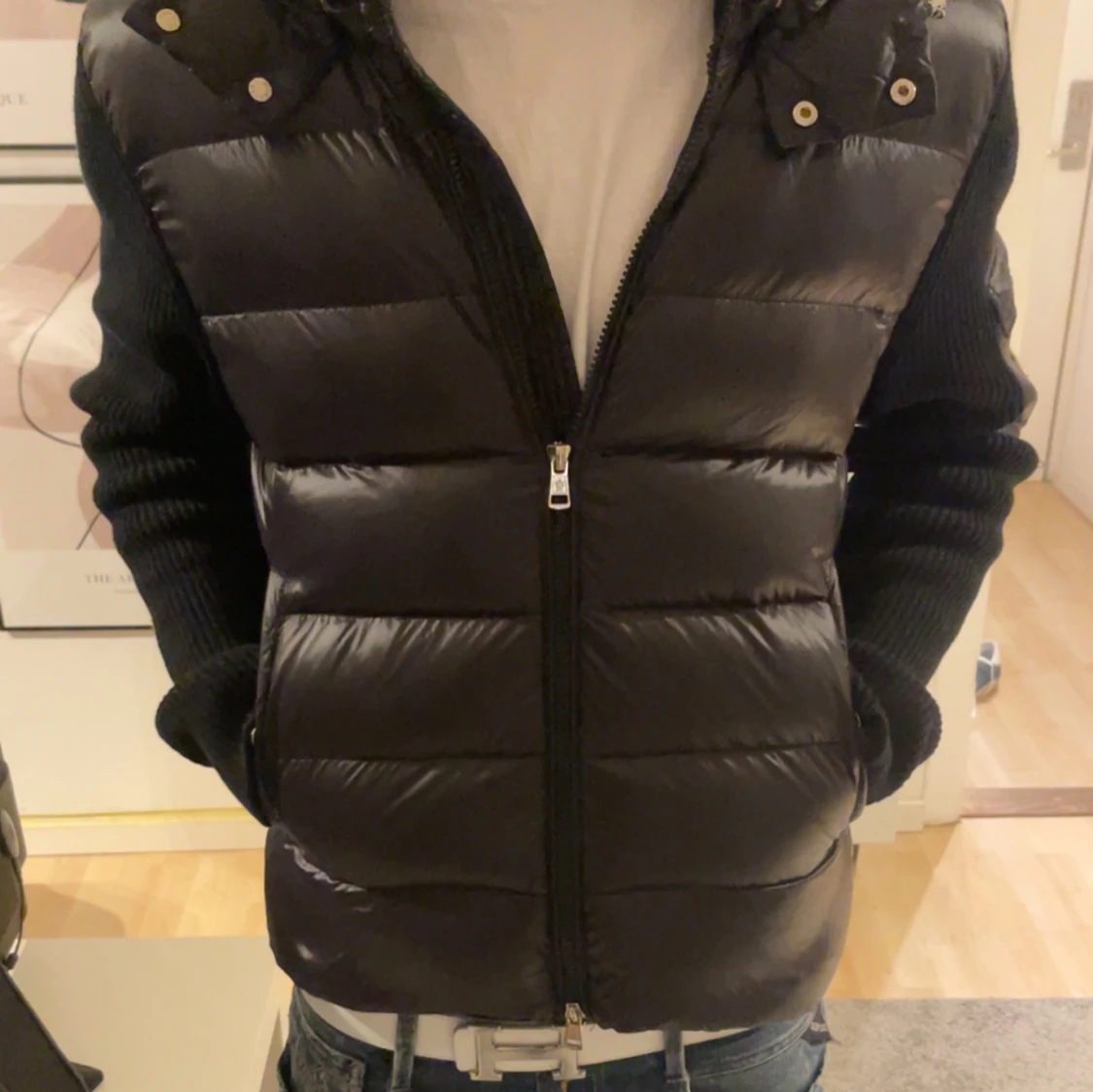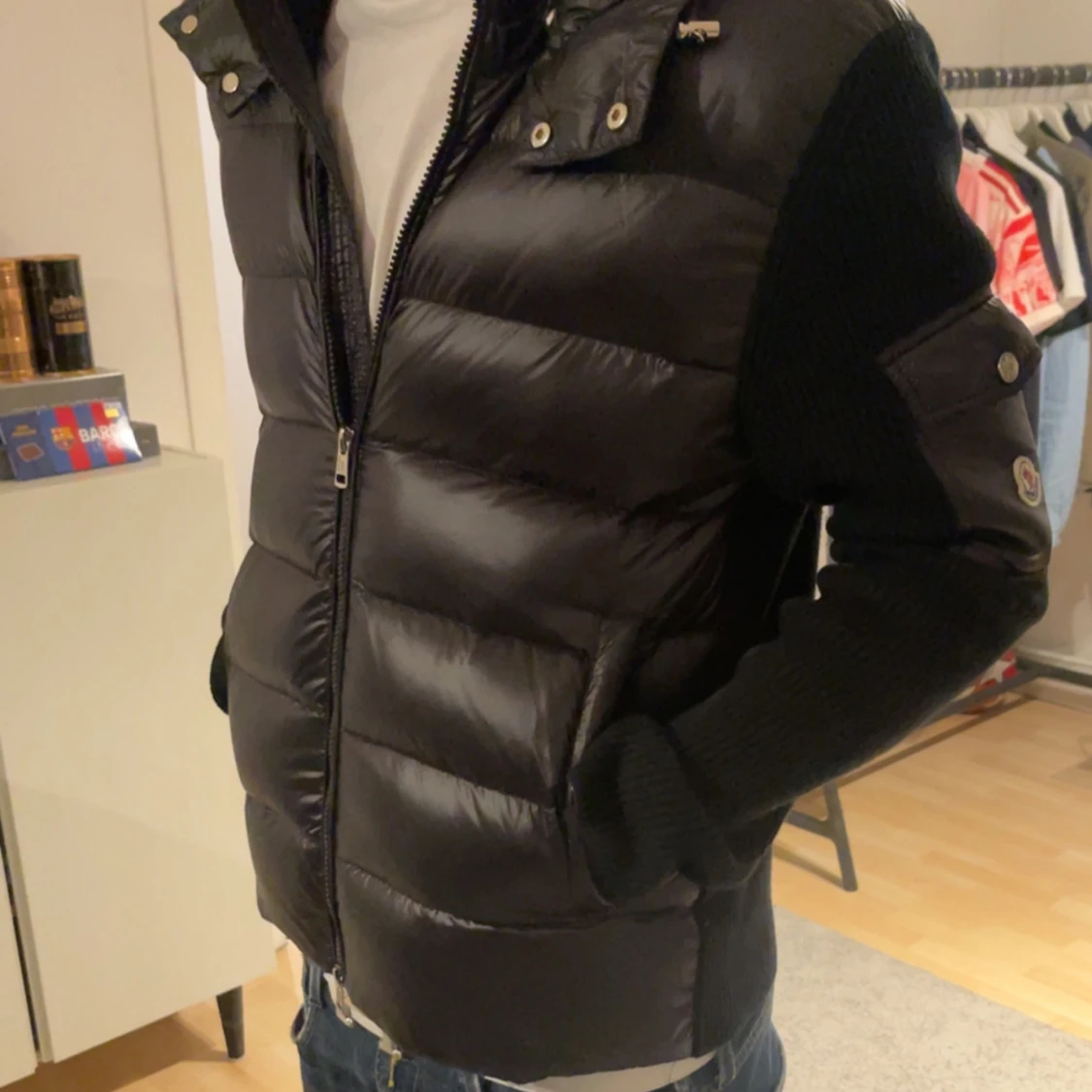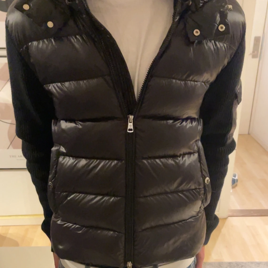 Säljer en svart pufferjacka från Moncler med glansig finish, stickade ärmar och avtagbar huva. Jackan har dragkedja framtill, ribbade muddar och Moncler-logga på ärmen. Perfekt för kalla dagar och riktigt snygg till streetwear.