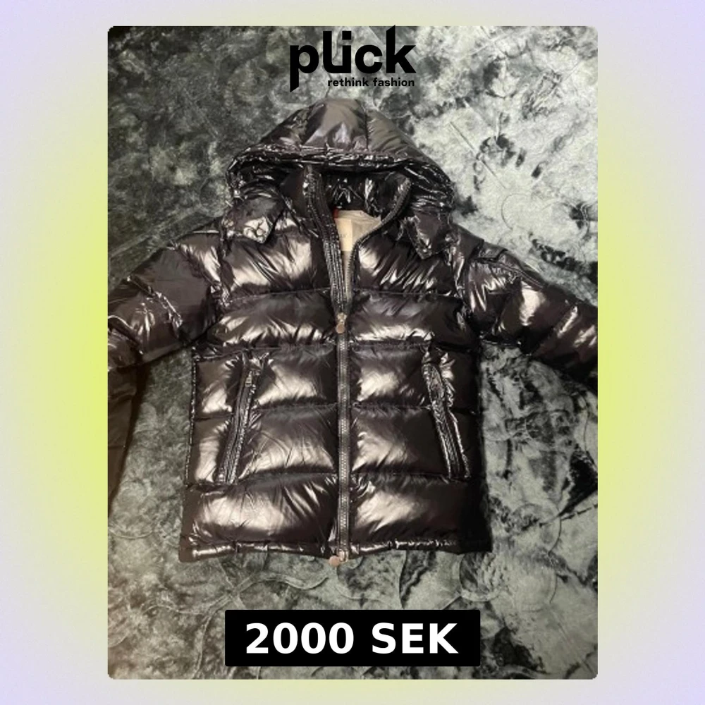 Snygg svart glansig dunjacka från Moncler med huva och dragkedja framtill. Jackan har två framfickor med dragkedja och quiltad design. Insidan är ljusgrå och har en innerficka med dragkedja samt Moncler-logga i nacken.