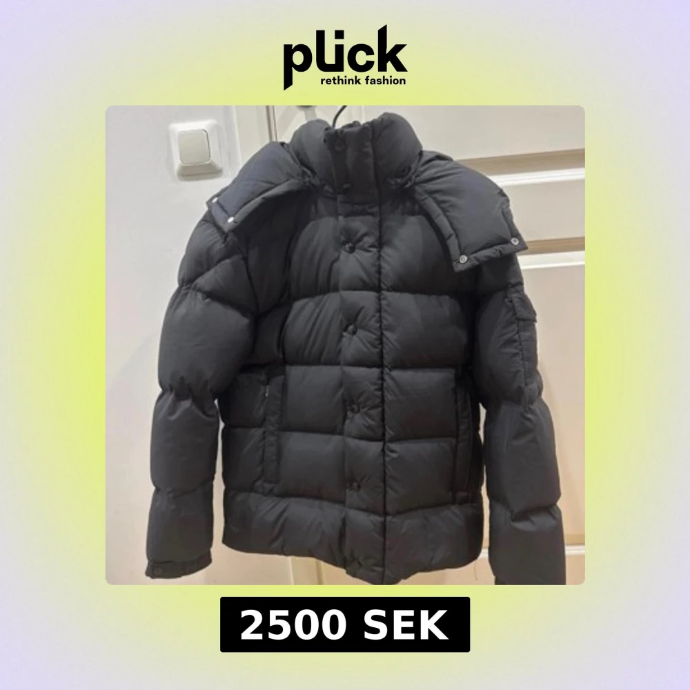 Svart pufferjacka från Moncler med avtagbar huva och klassisk logga på ärmen. Jackan har quiltad design, knappar framtill och praktiska fickor. Perfekt för kalla dagar och har en riktigt snygg, puffig look som sticker ut.