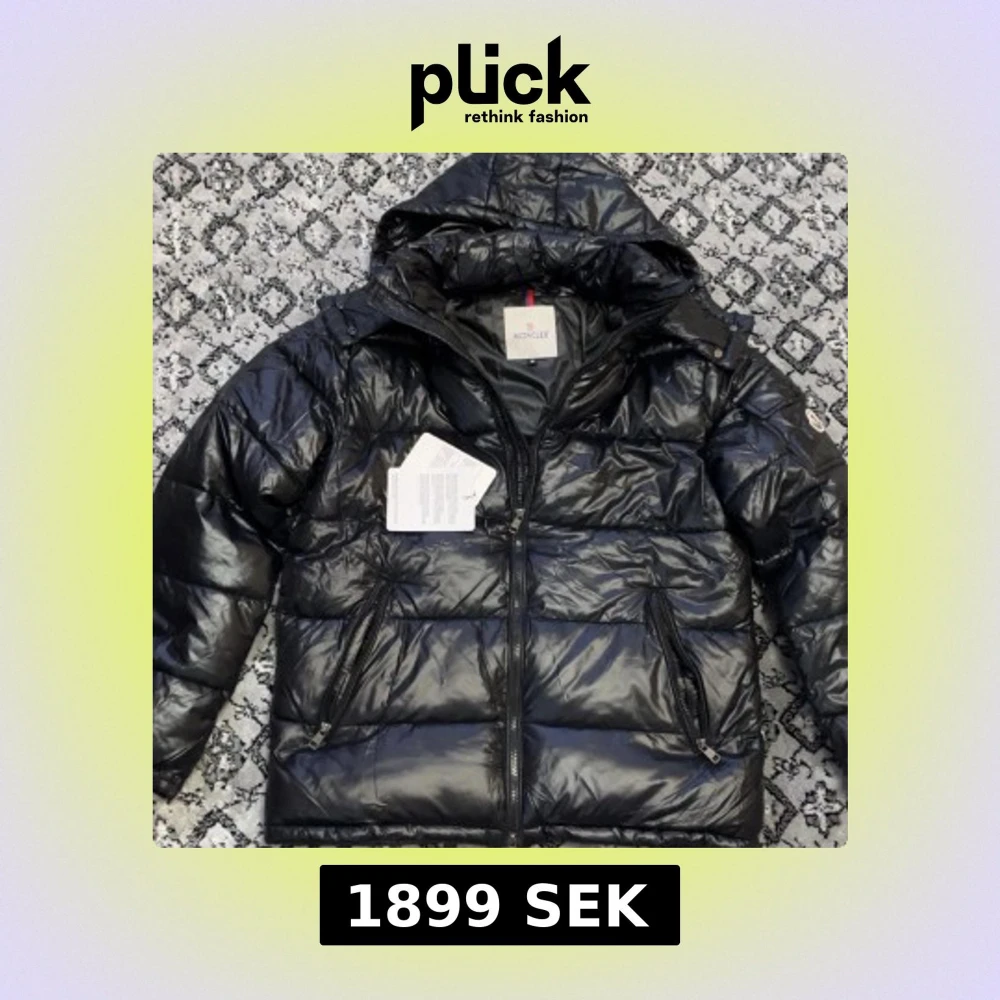 Svart pufferjacka från Moncler med glansig finish, huva och dragkedja framtill. Jackan har två snedställda fickor med dragkedja, quiltad design och Moncler-logga på ärmen. Insidan har en cool serietidningspatch. Perfekt för kalla dagar.