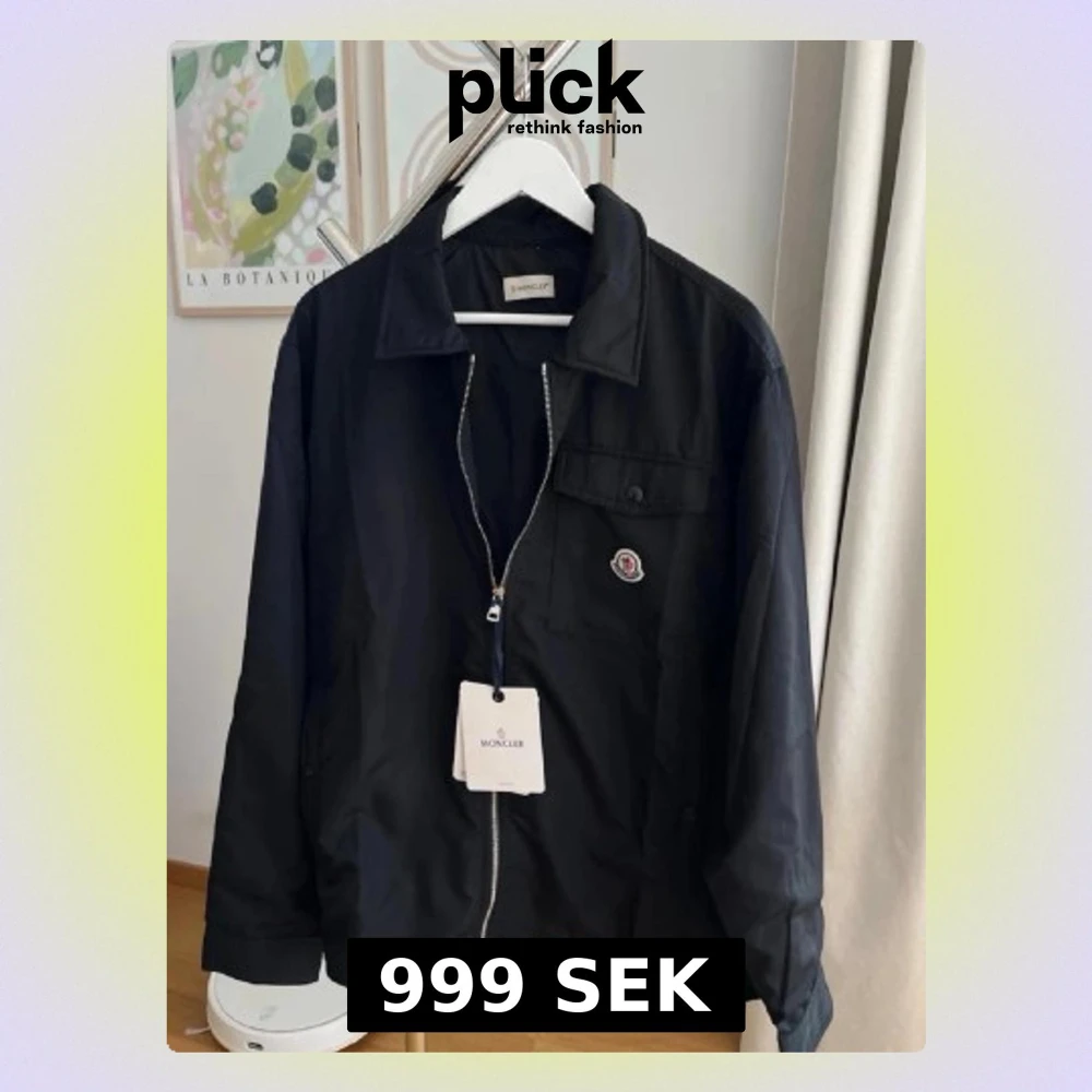 Snygg svart overshirt från Moncler med klassisk krage, bröstficka och logotyp på vänster sida. Jackan har hel dragkedja framtill och är tillverkad i ett lätt, slätt material som passar perfekt för lager-på-lager. Enkel och stilren design. Perfekt för våren/sommaren. Passar 182-187