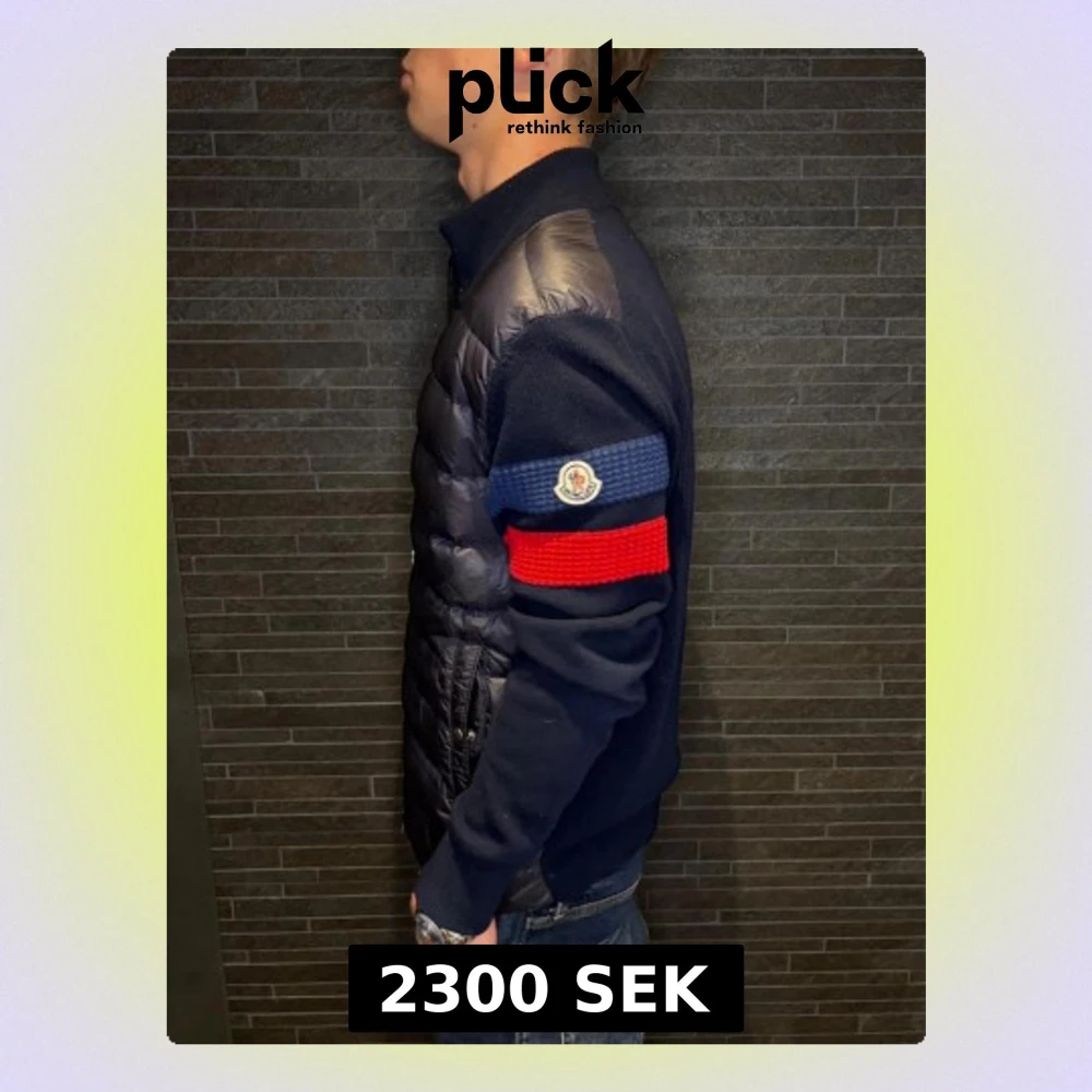 Snygg mörkblå pufferjacka från Moncler med quiltad front i glansigt material och stickade ärmar. Jackan har dragkedja framtill och coola röda och blå detaljer på ärmarna samt Moncler-logga på vänster arm. Perfekt för dig som vill ha en sportig och trendig look.
