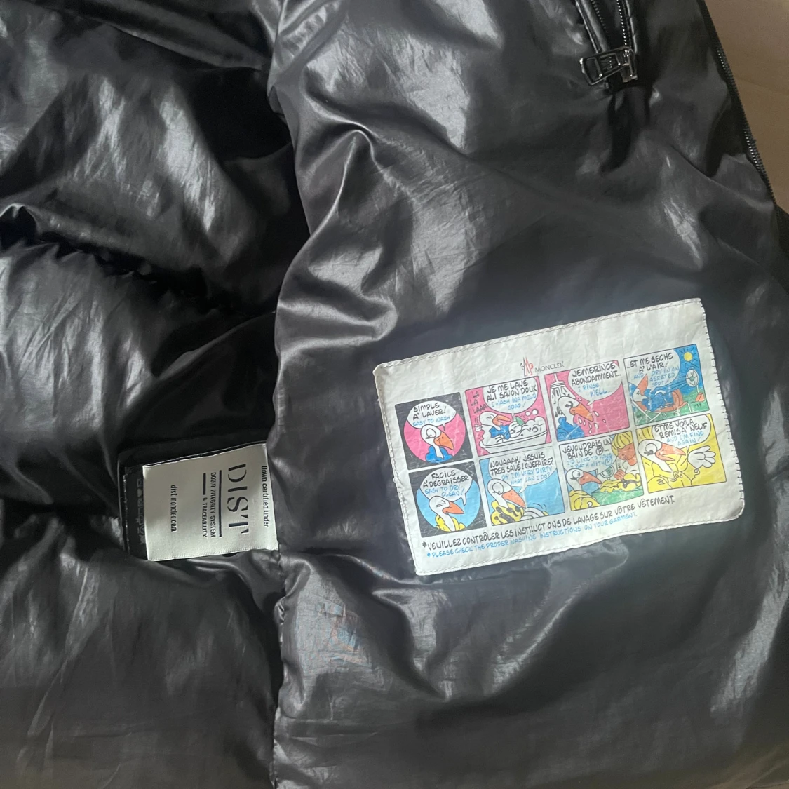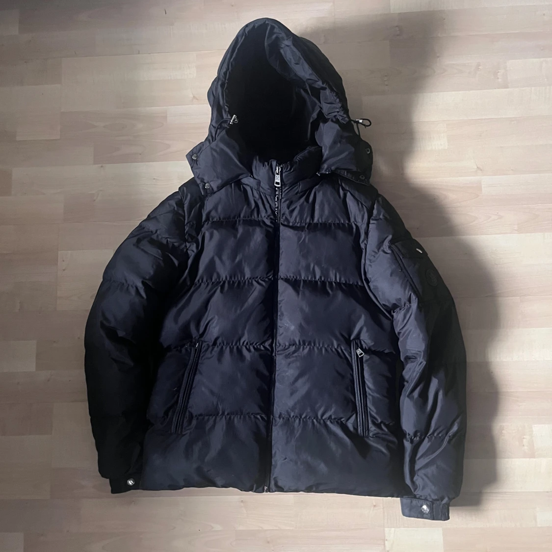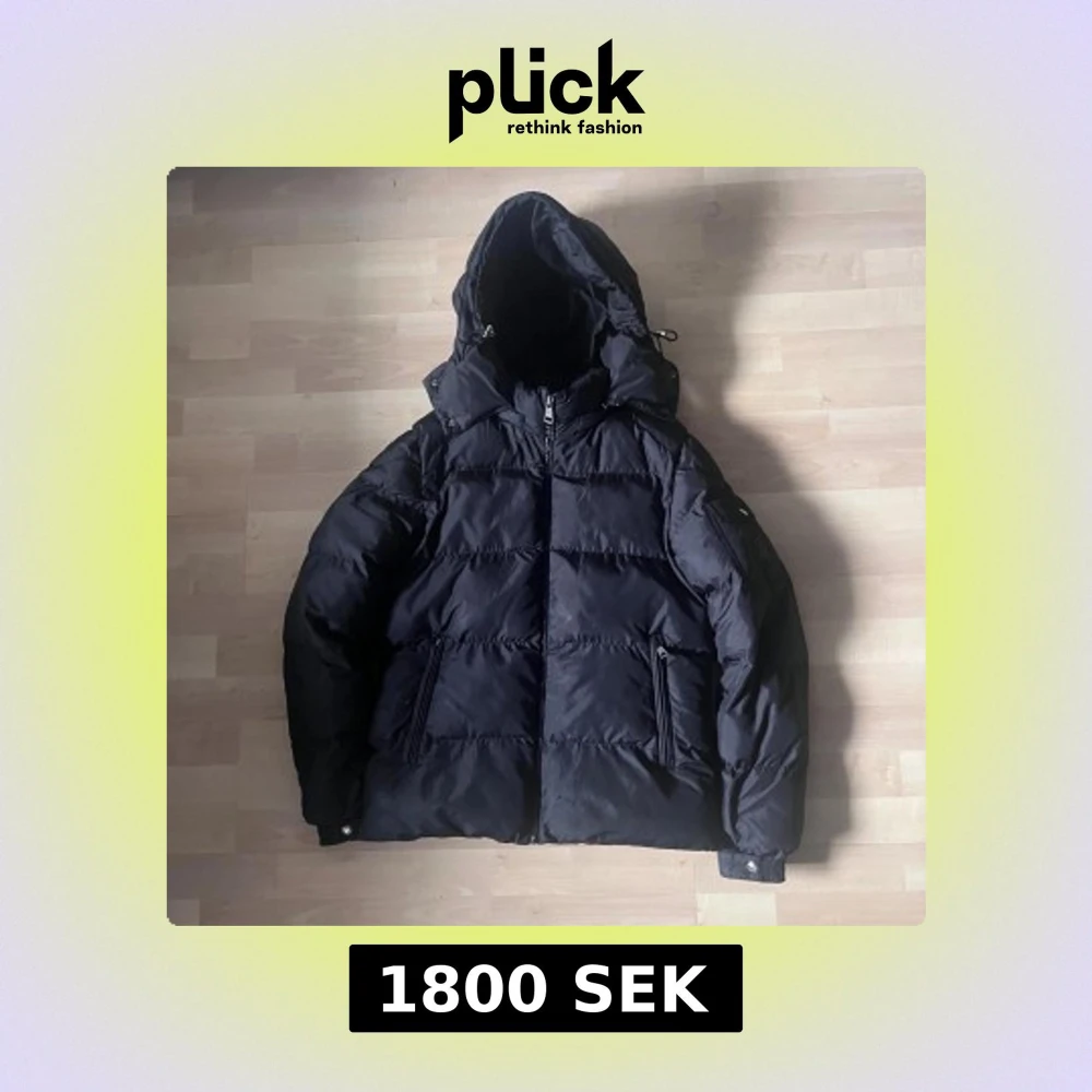Snygg svart dunjacka från Moncler med stor huva och dragkedja framtill. Jackan har två fickor med dragkedja och coolt serietidningsfoder på insidan. Perfekt för kalla dagar och har en klassisk pufferstil som alltid är trendig.
