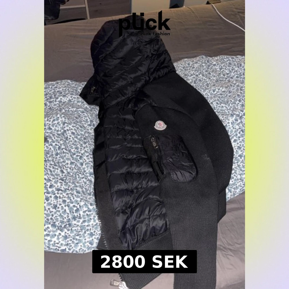 Svart pufferjacka från Moncler med stickade ärmar och huva. Jackan har quiltad framsida, dragkedja och en ficka med Moncler-logga på ärmen. Materialmix av polyester och stickad textil ger en schysst look. Perfekt för dig som gillar streetstyle och vill ha något varmt.