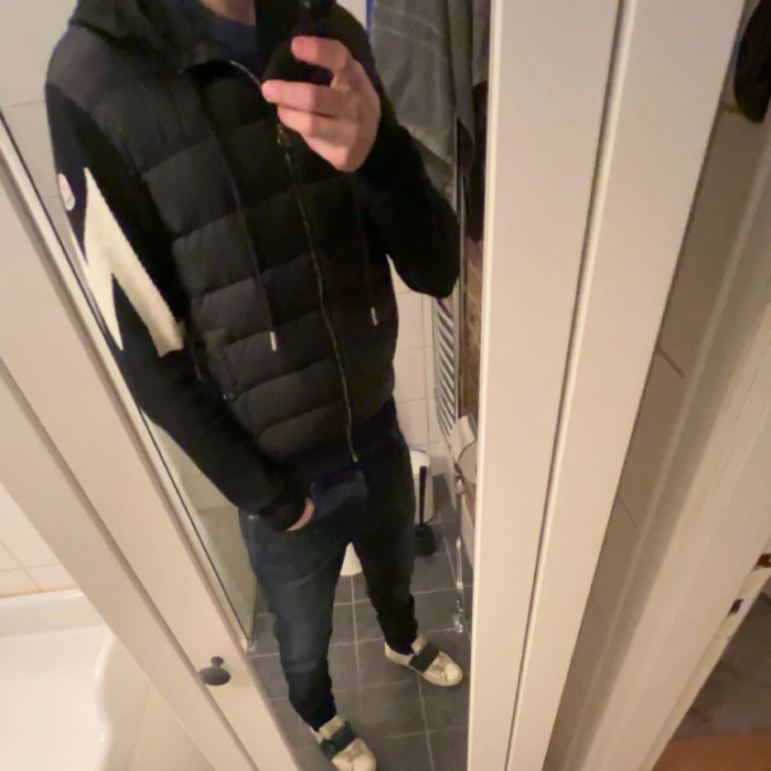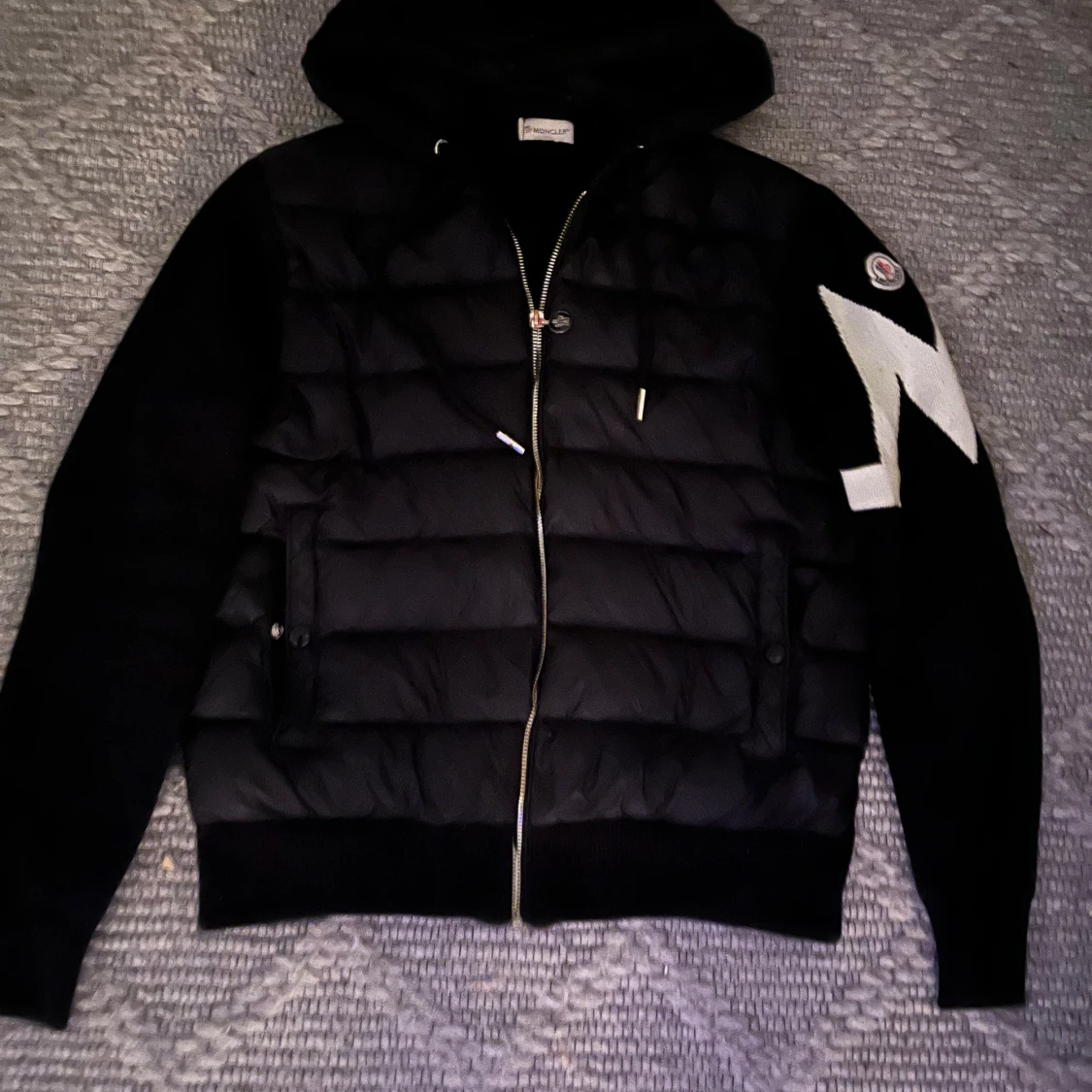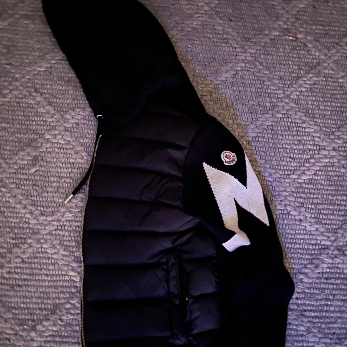 Snygg svart cardigan från Moncler med dragkedja och huva. Cardiganen har ett distinkt vitt mönster på ärmen och Moncler-logotypen på axeln. Perfekt nu för våren. Det är en sällsynt och ovanlig cardigan. Dragkedjan kan krångla ibland men fungerar perfekt om man lär sig. Storlek M, pris kan diskuteras. Hör av er om det minsta mvh Axel.