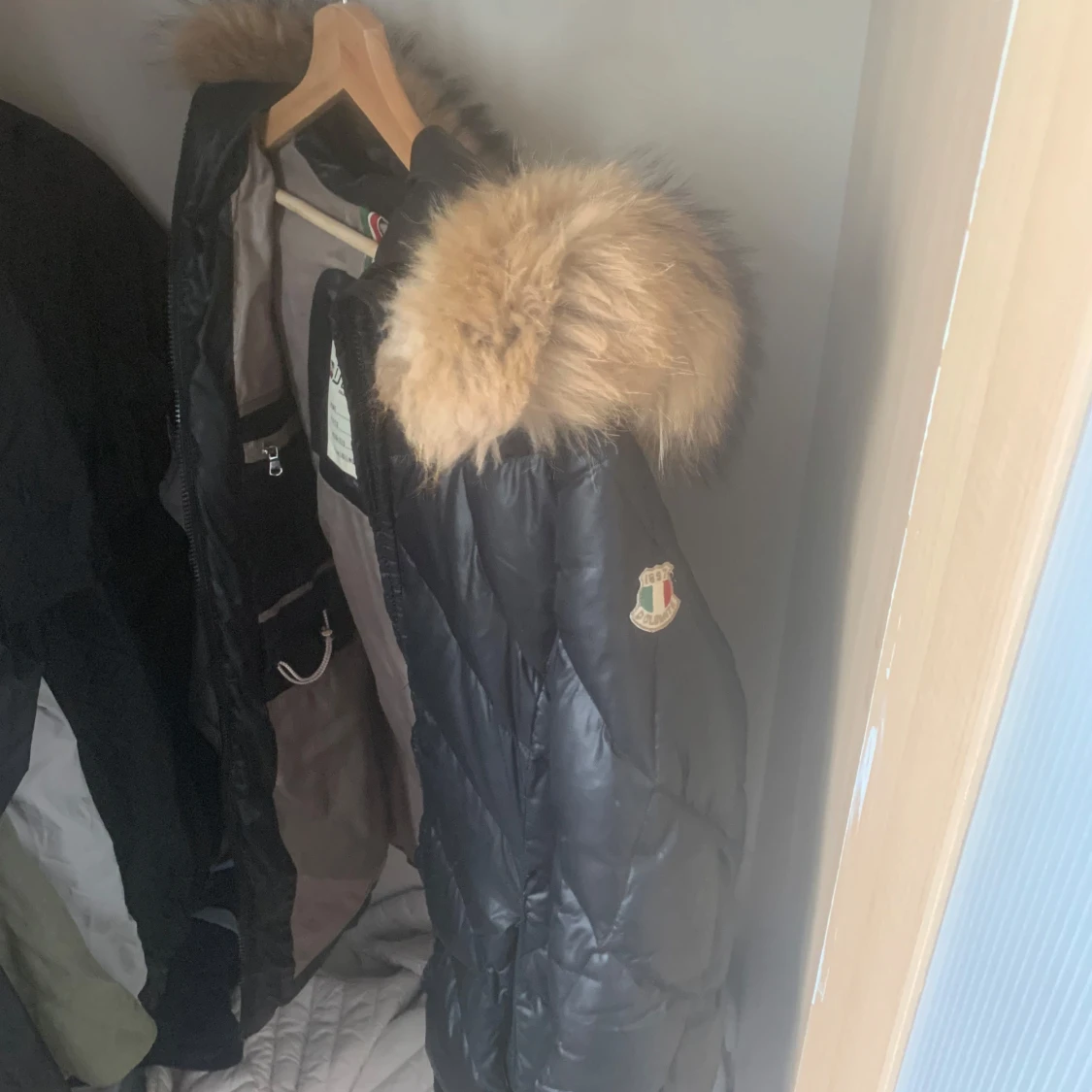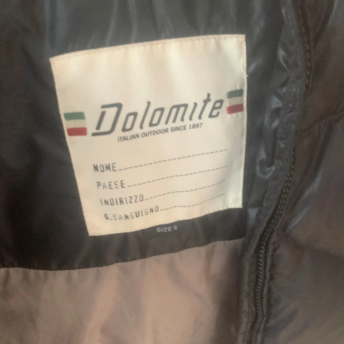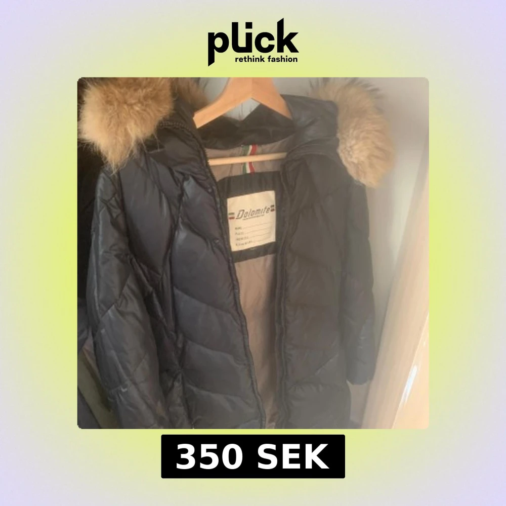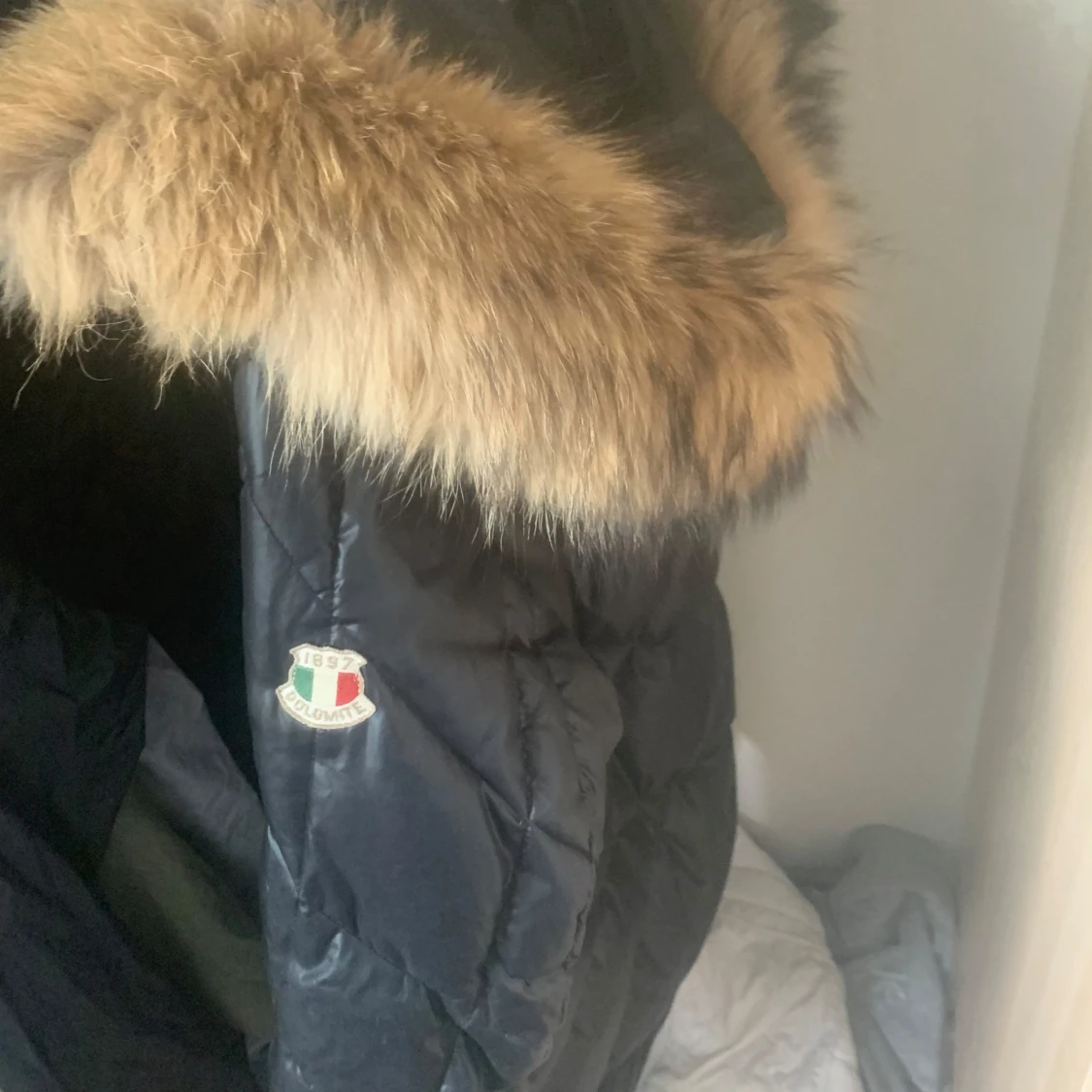 Svart dunjacka från Dolomite med stor fluffig fuskpäls på huvan och snygga quiltade detaljer. Jackan har dragkedja framtill och en badge på ärmen. Perfekt för kalla dagar när du vill hålla stilen och värmen.