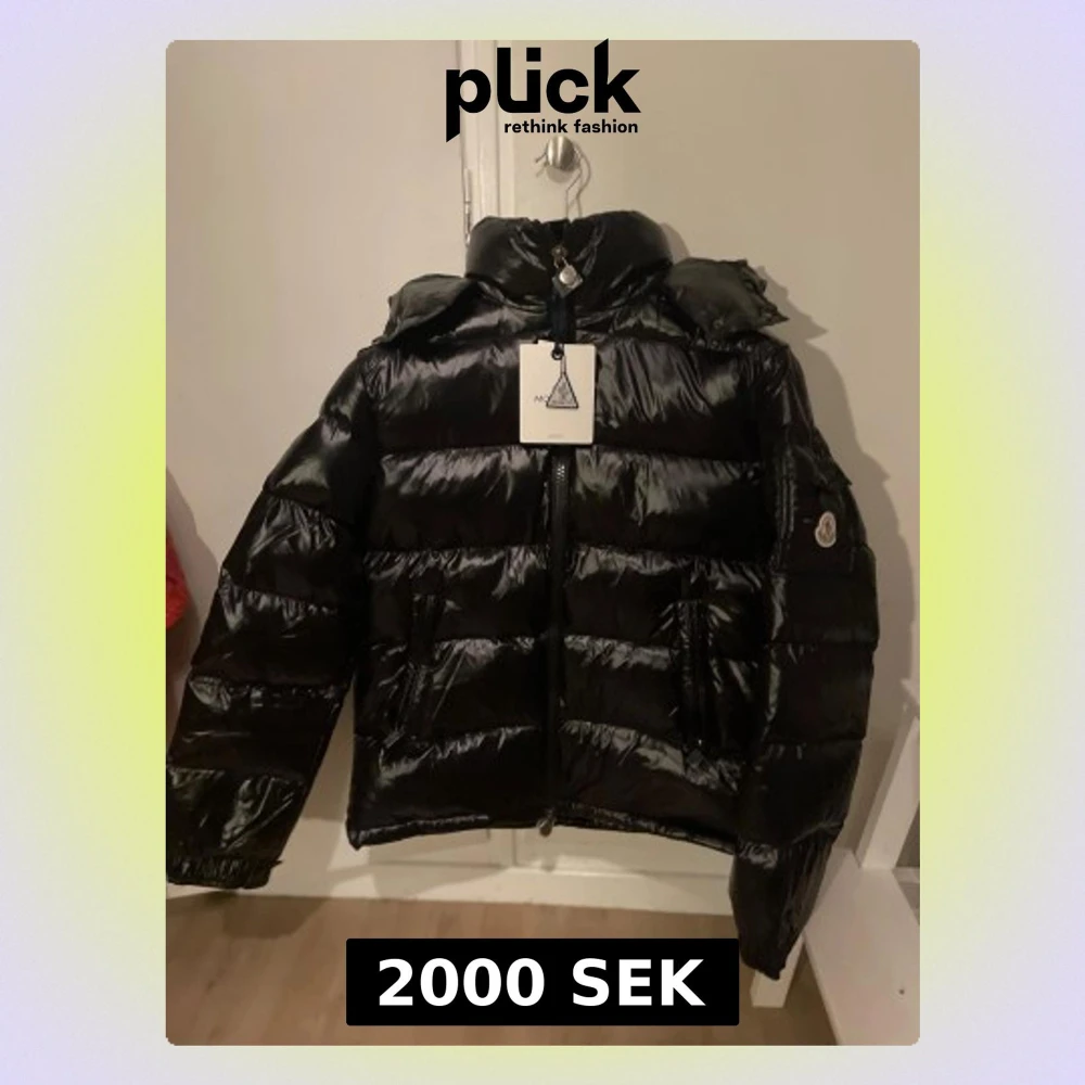Säljer en svart pufferjacka från Moncler med glansig finish och hög krage. Jackan har dragkedja framtill, två sidofickor med dragkedja och en Moncler-logga på ärmen. Insidan har ett coolt serietryck och märkestaggar. Perfekt för kalla dagar och riktigt snygg streetstil.