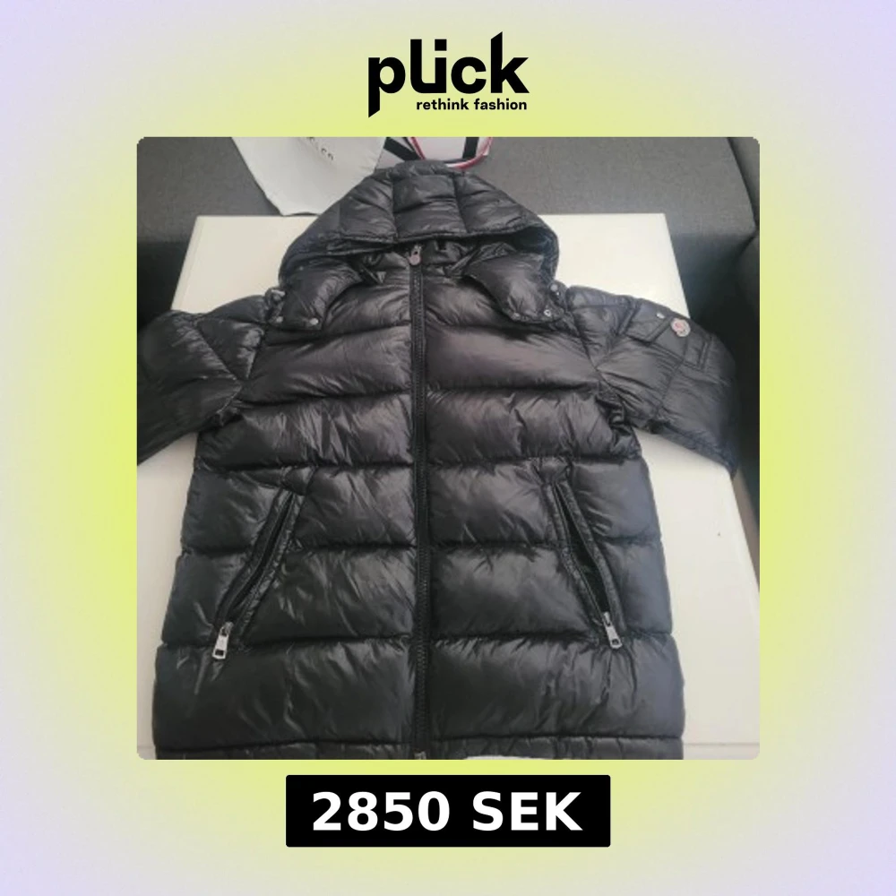 Svart pufferjacka från Moncler med glansig finish, huva och två dragkedjeförsedda fickor. Jackan har klassisk Moncler-logga på ärmen och är fylld med certifierat dun. Perfekt för kalla dagar. Storlek 3 som motsvarar L