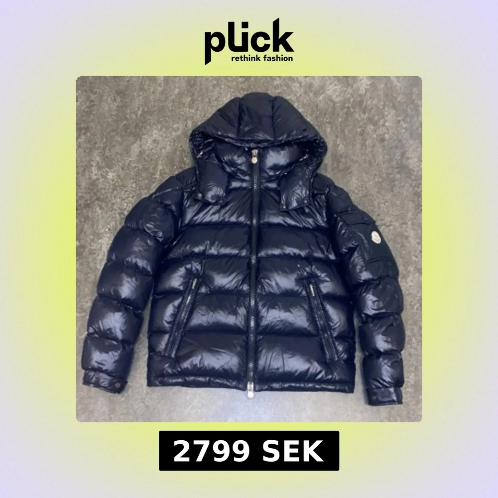 Säljer en Moncler Maya dunjacka i mörkblått med glansig finish. Jackan har huva, tvåvägsdragkedja, två snedställda fickor med dragkedja och Moncler-logga på ärmen. Insidan är brun och jackan är riktigt puffig och varm – perfekt för kalla dagar.